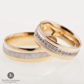 Венчални халки от " Jacklin " в бяло и жълто злато, мат и гланц с диаманти
