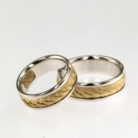 Венчални халки от "Jacklin " в бяло и жълто злато с лазерна шлифовка, олекотени