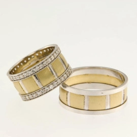 Венчални халки от "Jacklin " в бяло злато гланц и жълто злато мат със цирконии