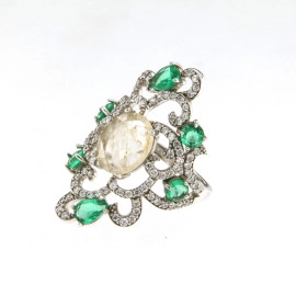 Пръстен от "Jacklin " сребро с цирконии, синтетичен изумруд и камък "Косите на Венера"