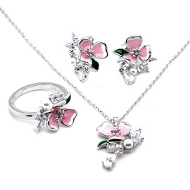 Комплект колие, обеци и пръстен от “Jacklin ” в сребро с циркони, цветен емайл и естествена перла.