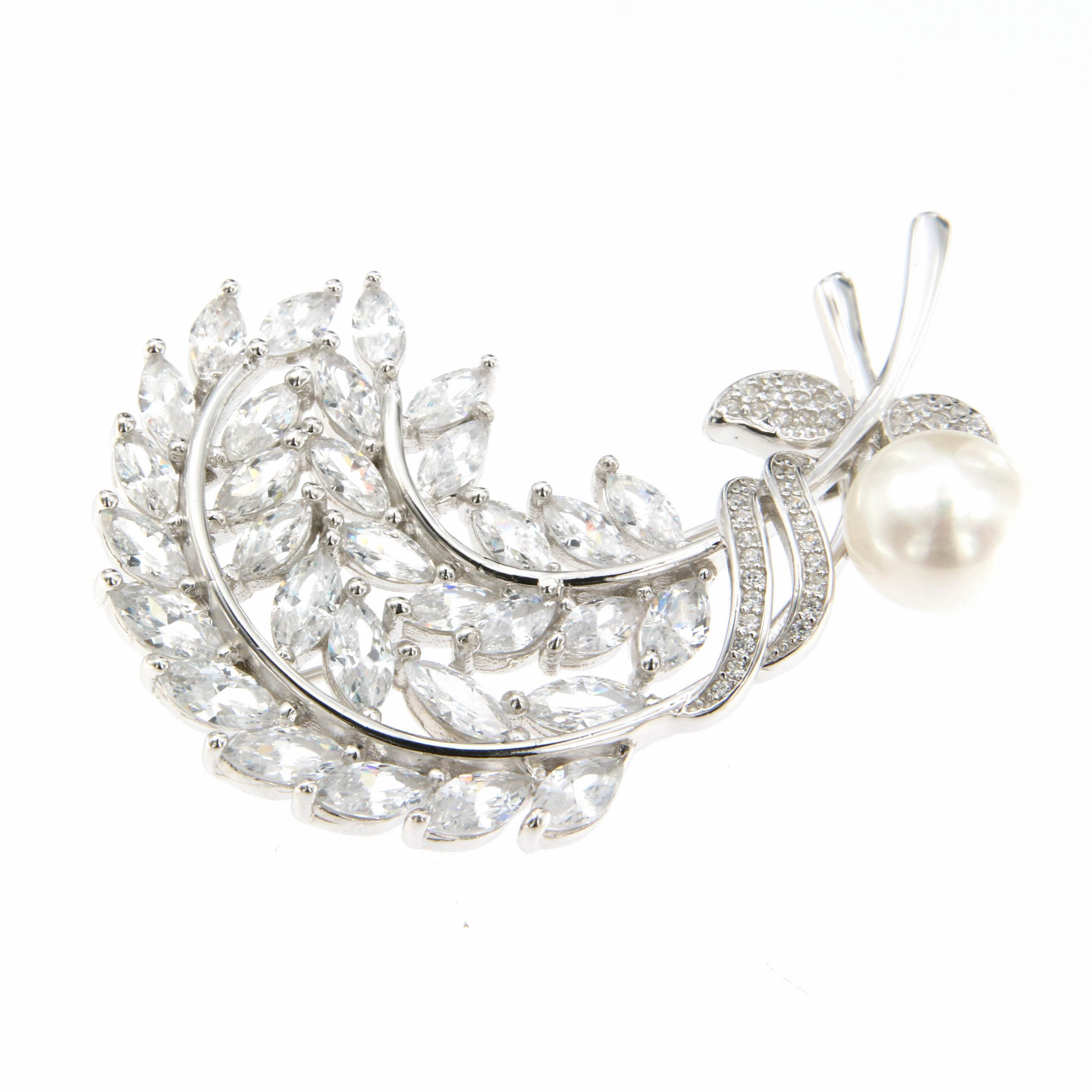 Брошка "Листо" от " Jacklin hugasian " в сребро с цирконий и перла.