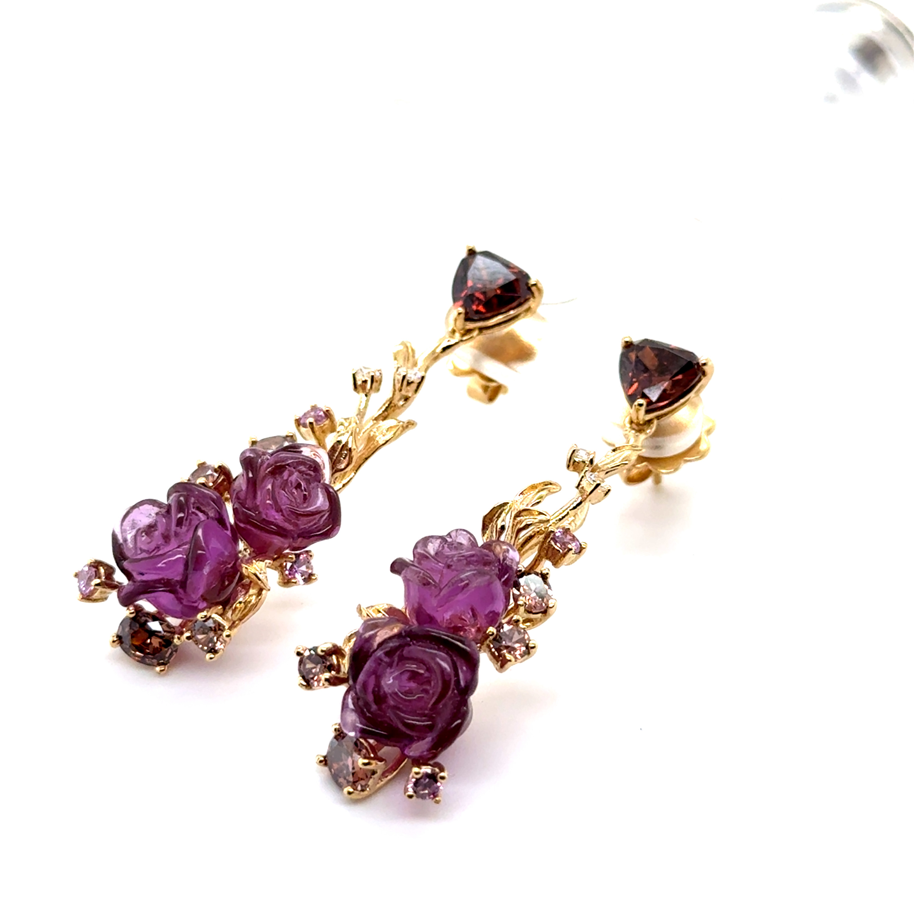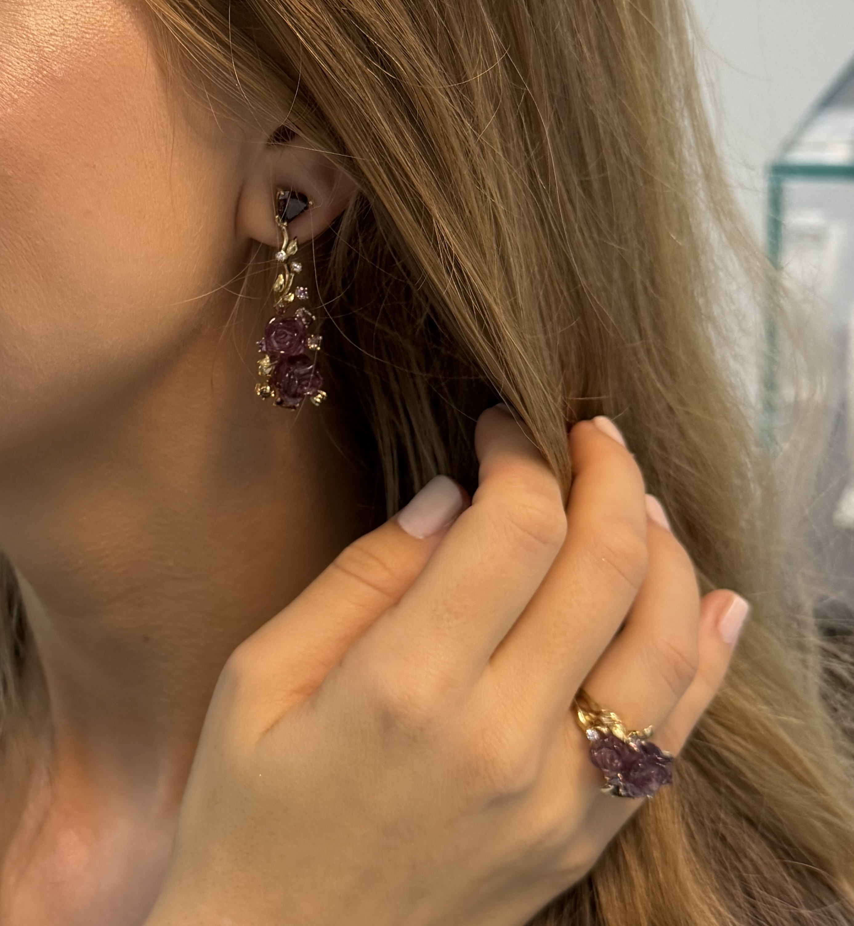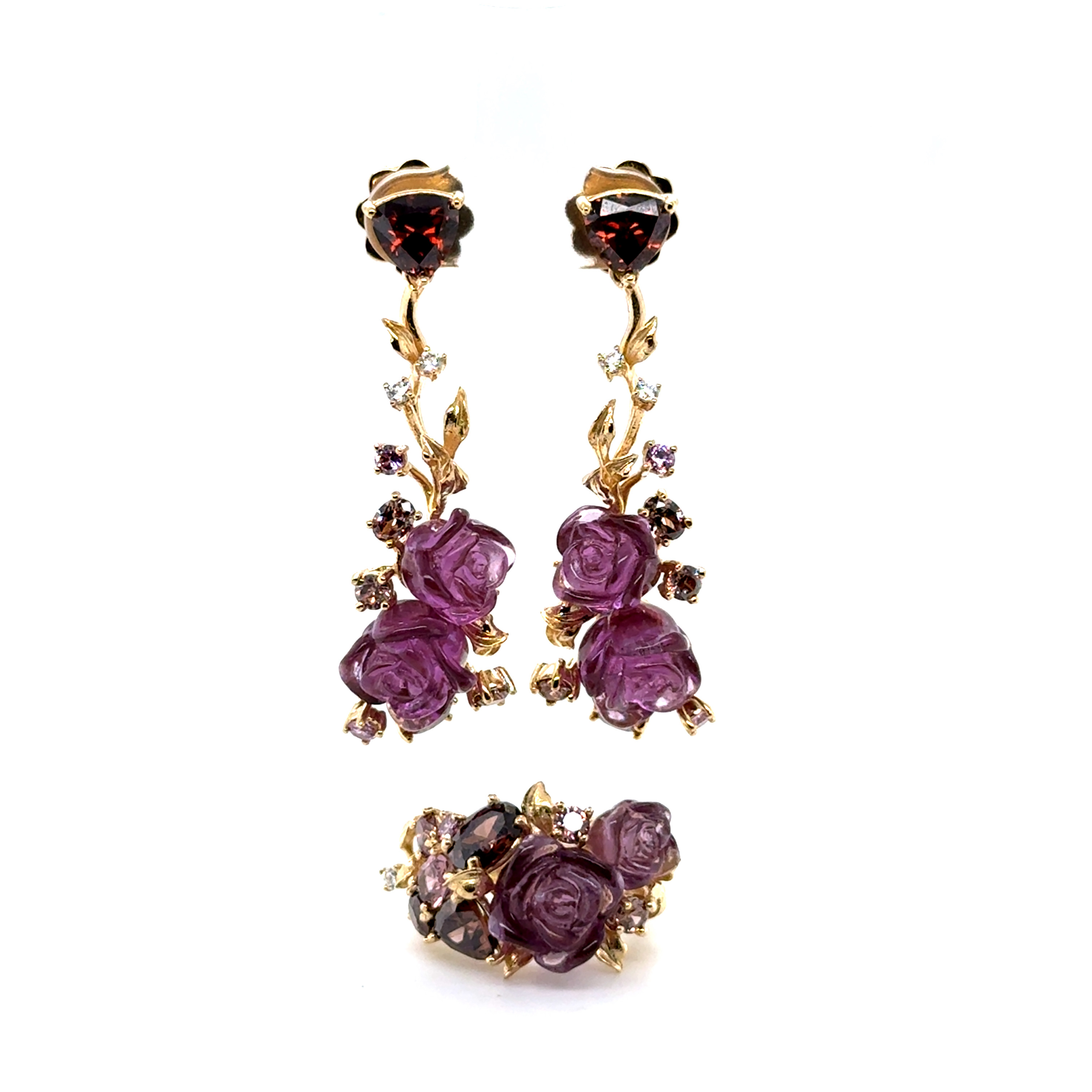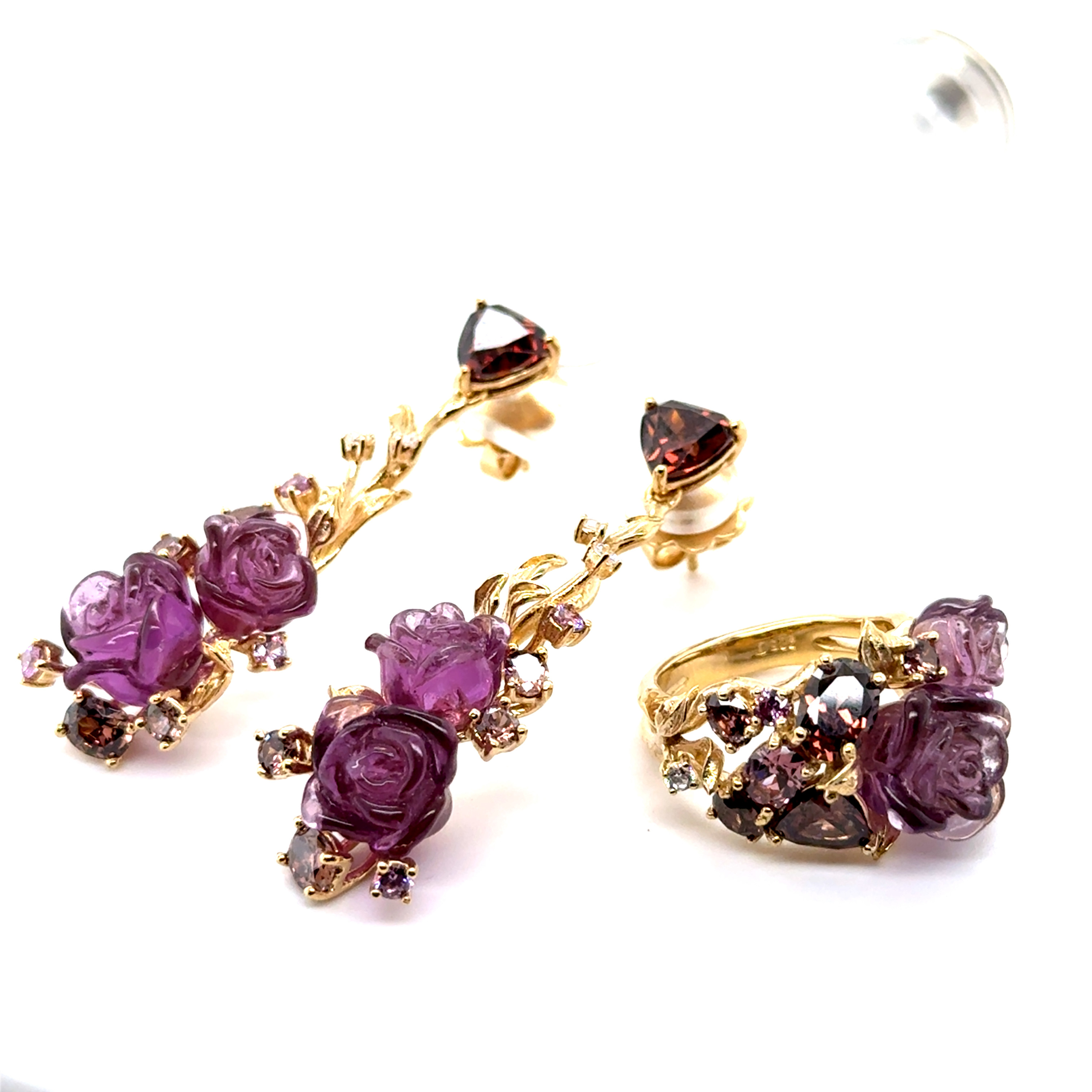 Комплект, обеци и пръстен от “Jacklin hugasian” в сребро с позлата ,аметист и опушен топаз
