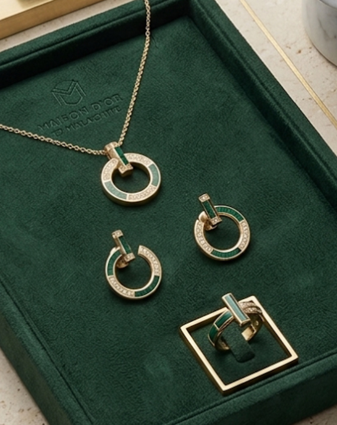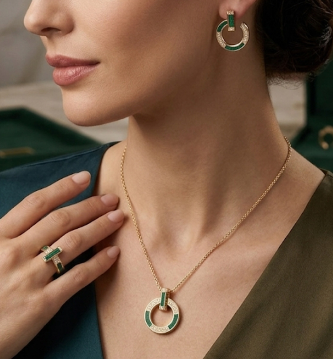 Комплект от “Jacklin hugasian” в сребро с позлата, малахит и циркони.