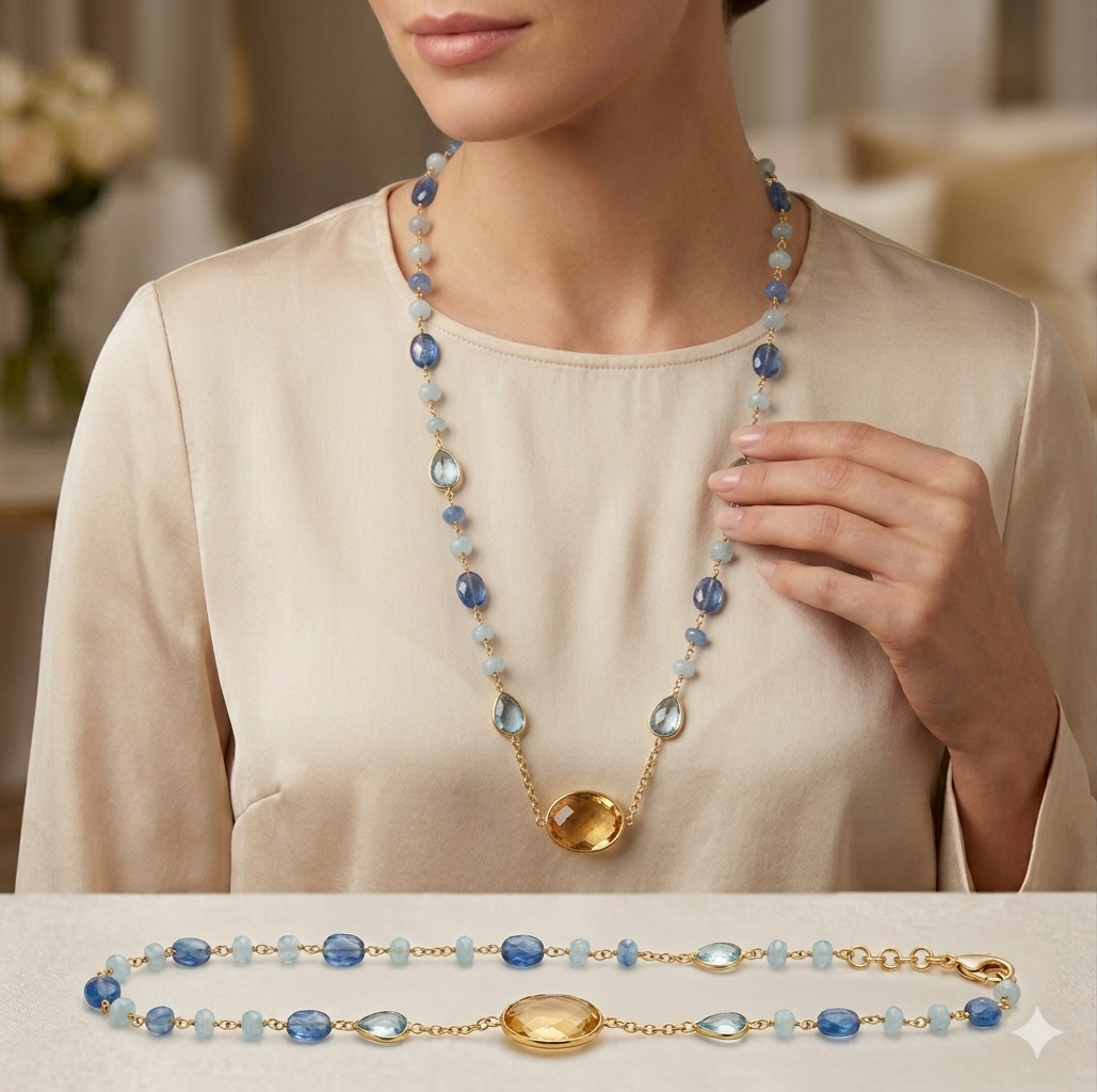 Колие от “Jacklin hugasian” в сребро с позлата, аквамарин,златист и син топаз