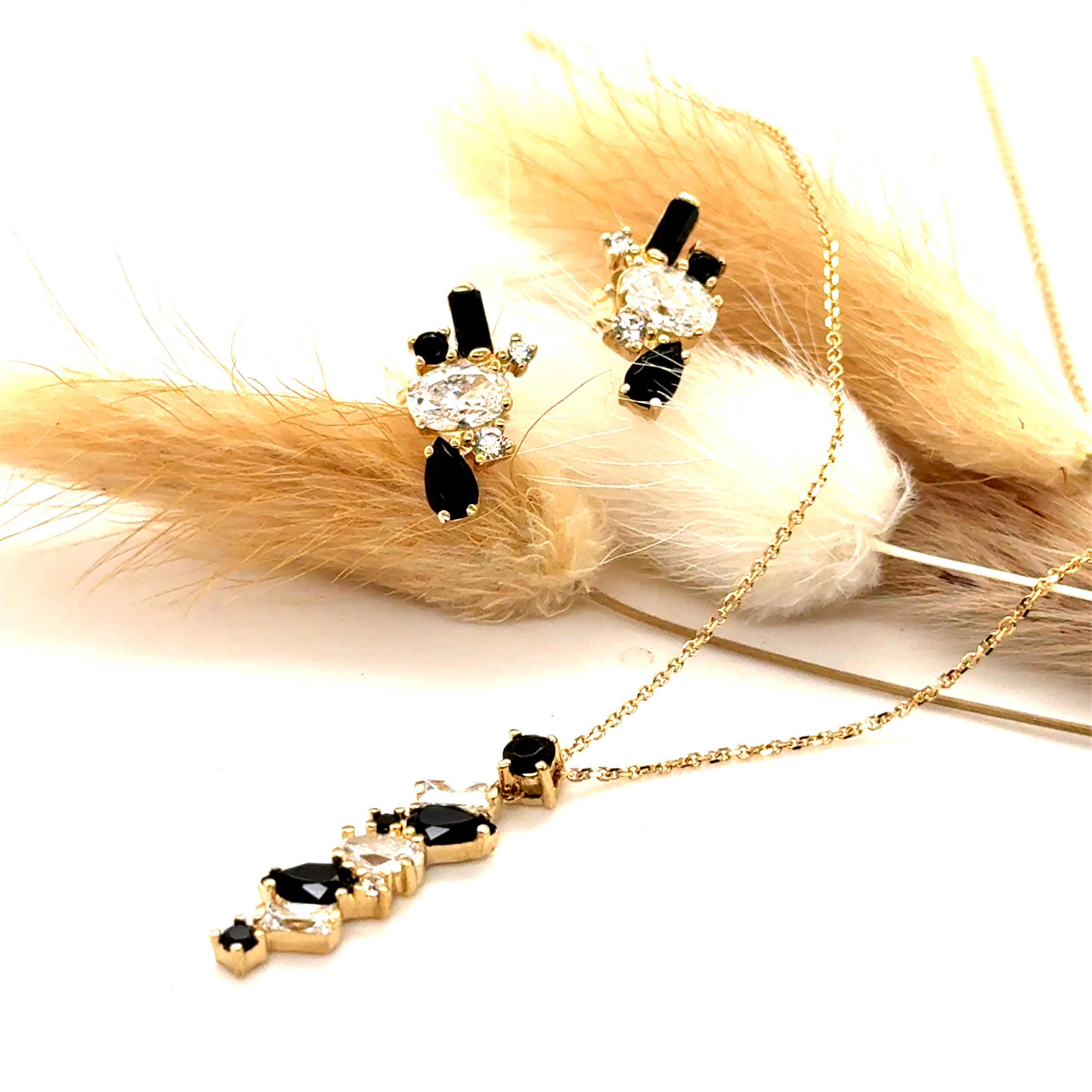 Комплект от “Jacklin hugasian” в жълто злато с оникс и цирконий.