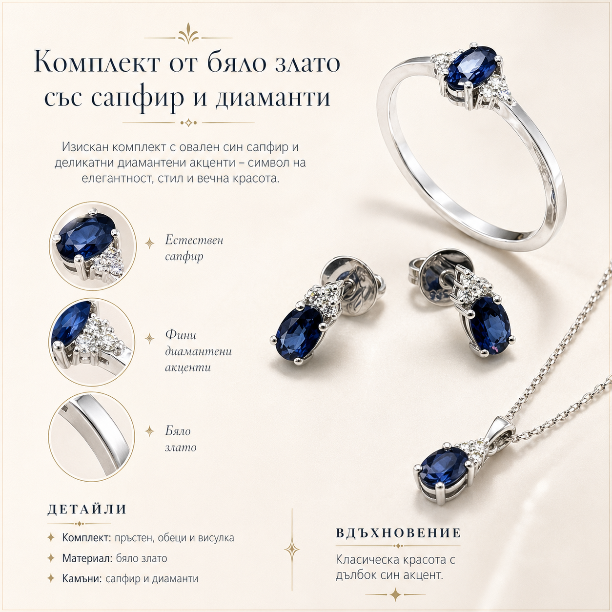 Комплект от "Jacklin hugasian" в бяло злато със сапфир и диаманти.