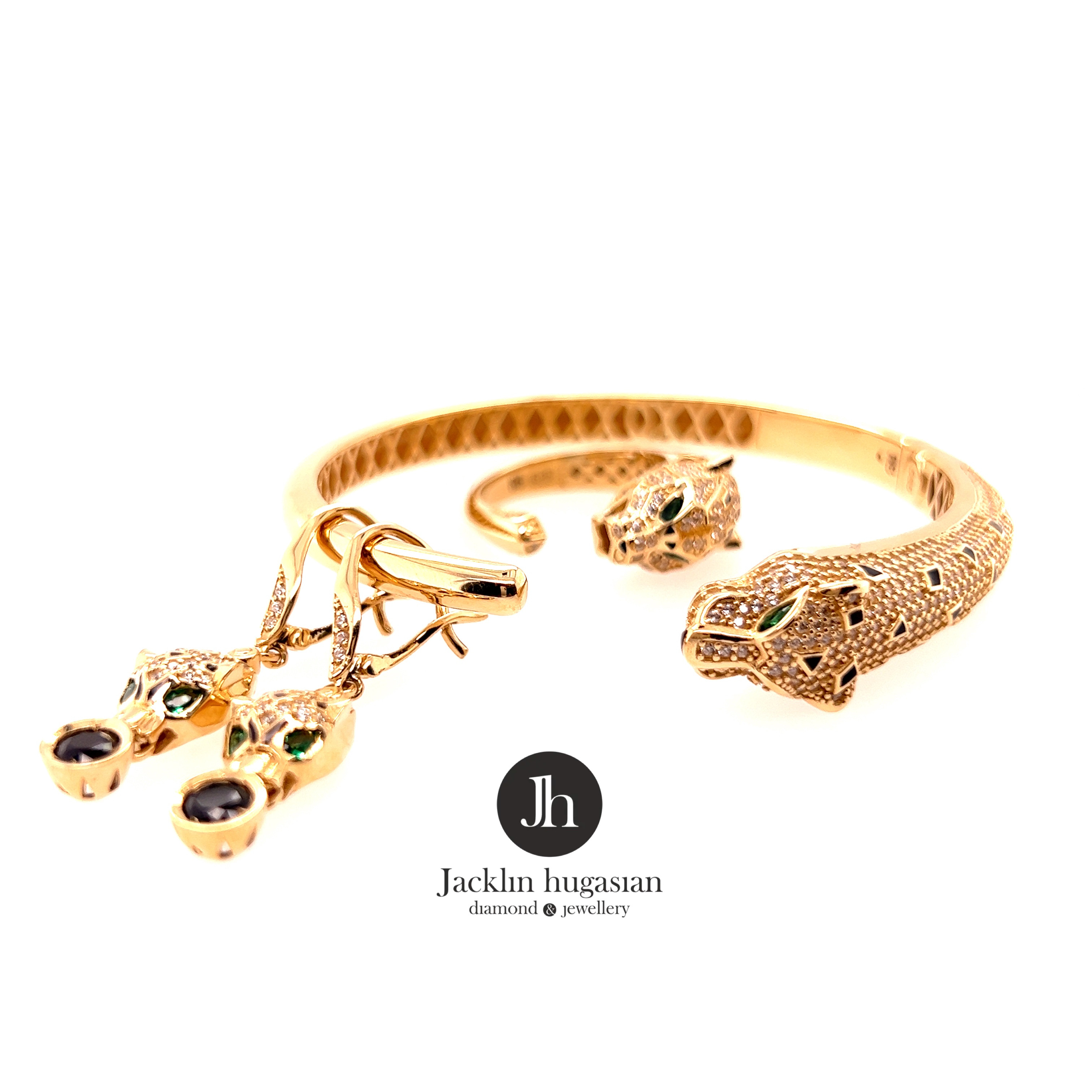 Комплект от "Jacklin hugasian " в жълто злато с изумруд и цирконии.