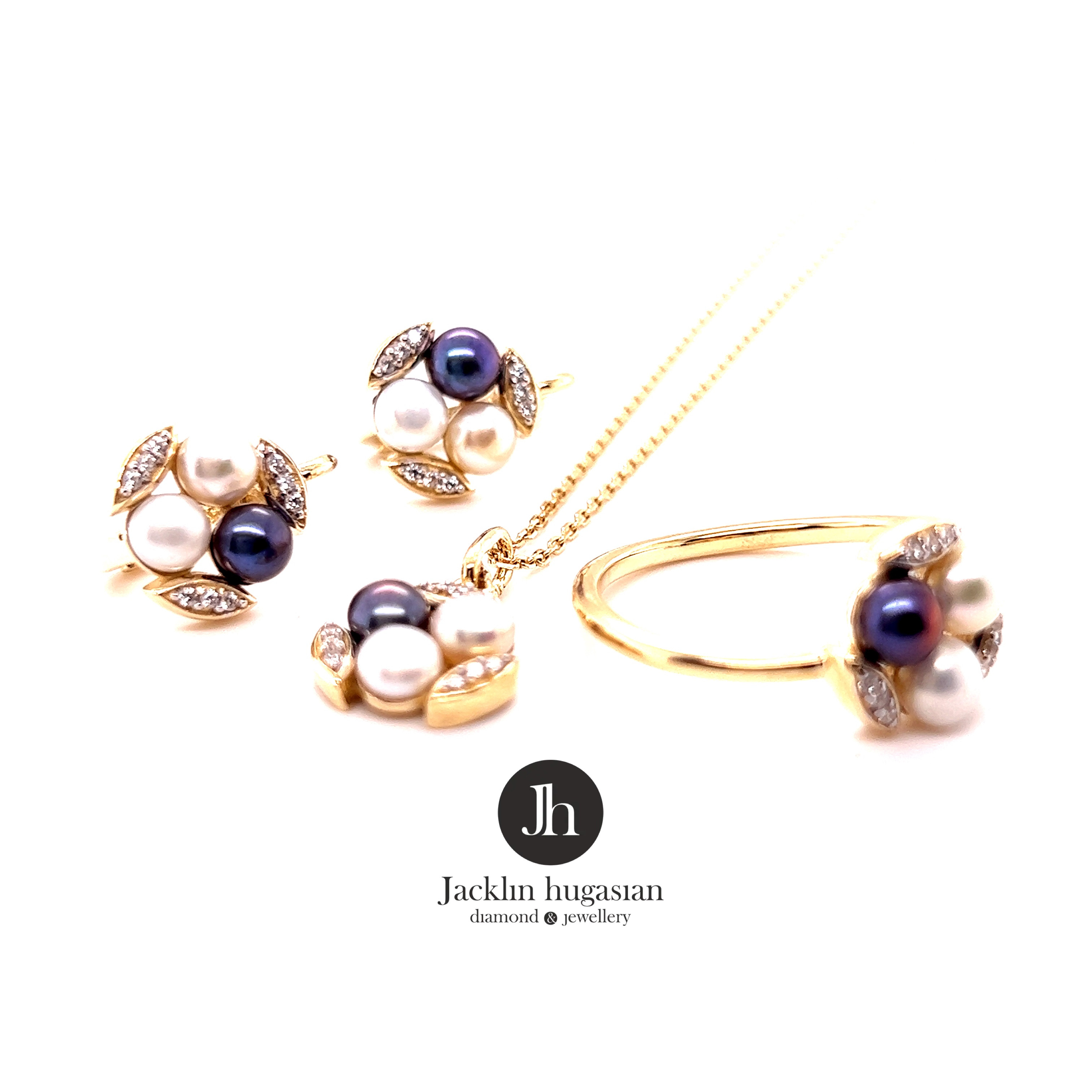 Комплект от “Jacklin hugasian” в жълто злато с тъмни и бели перли, и цирконии.