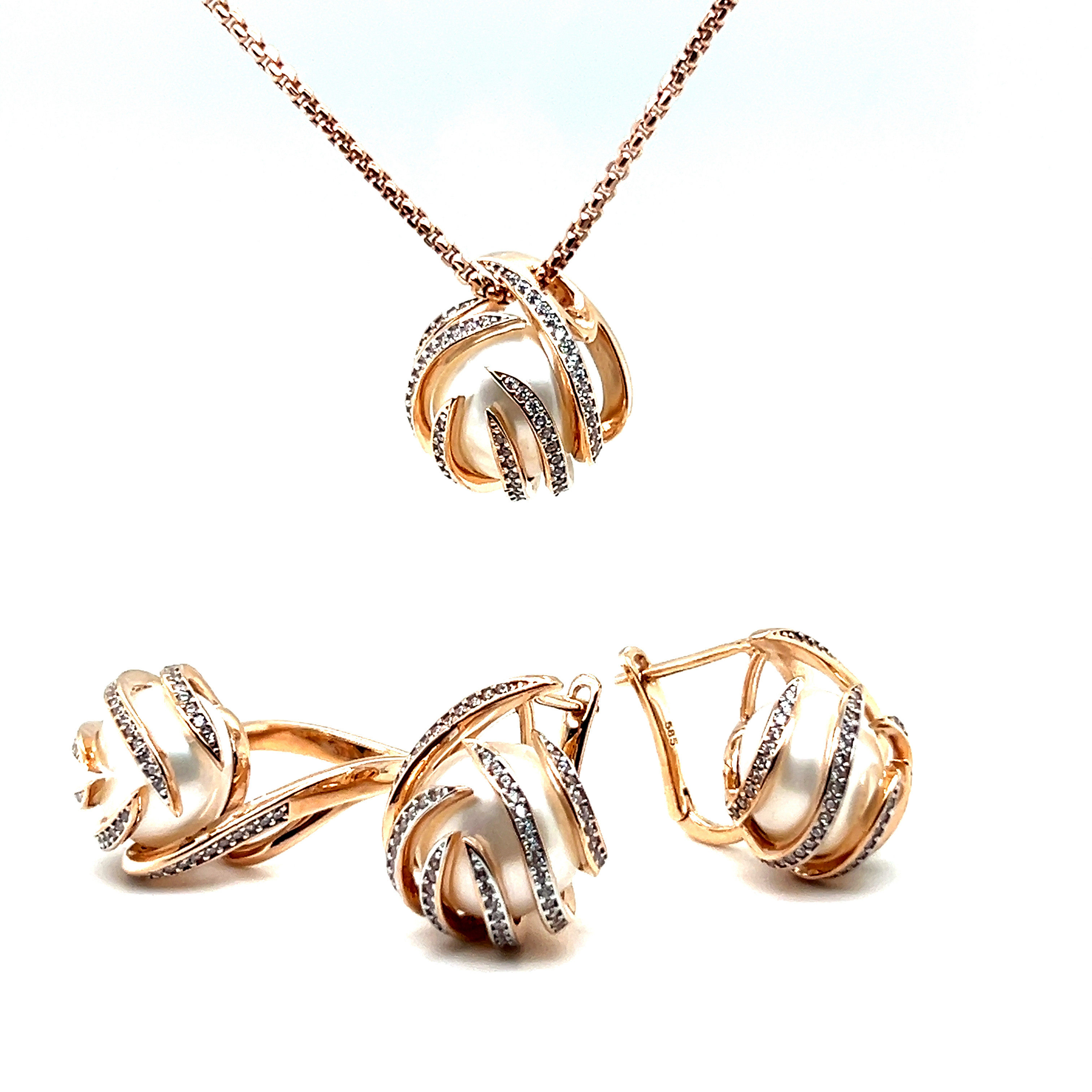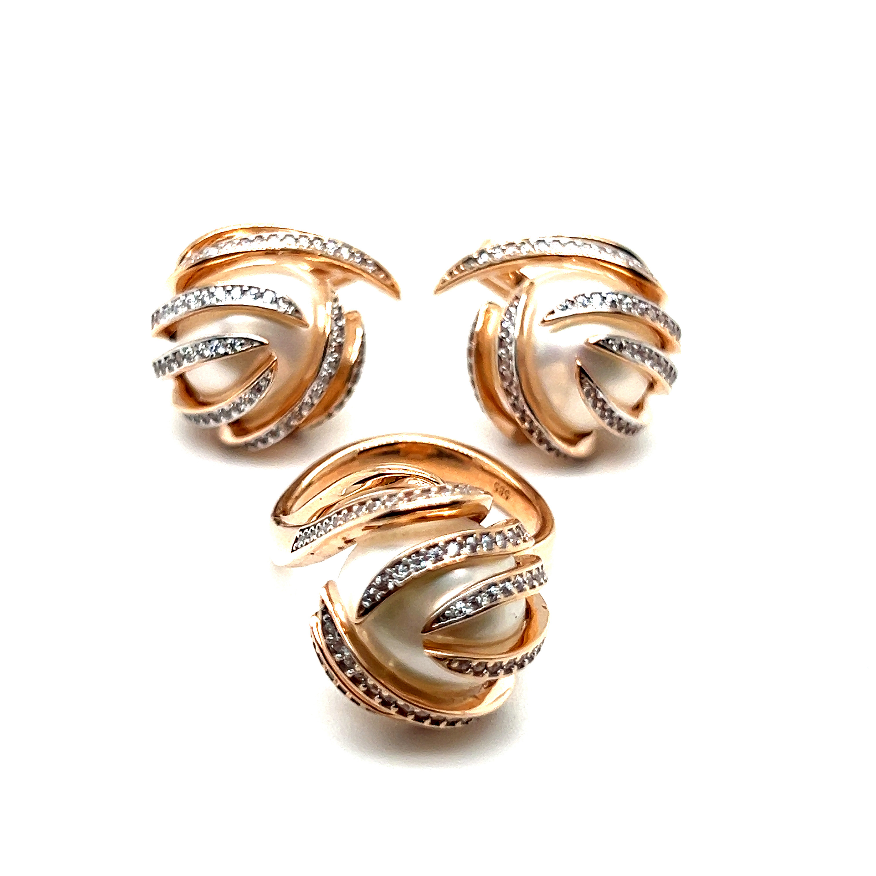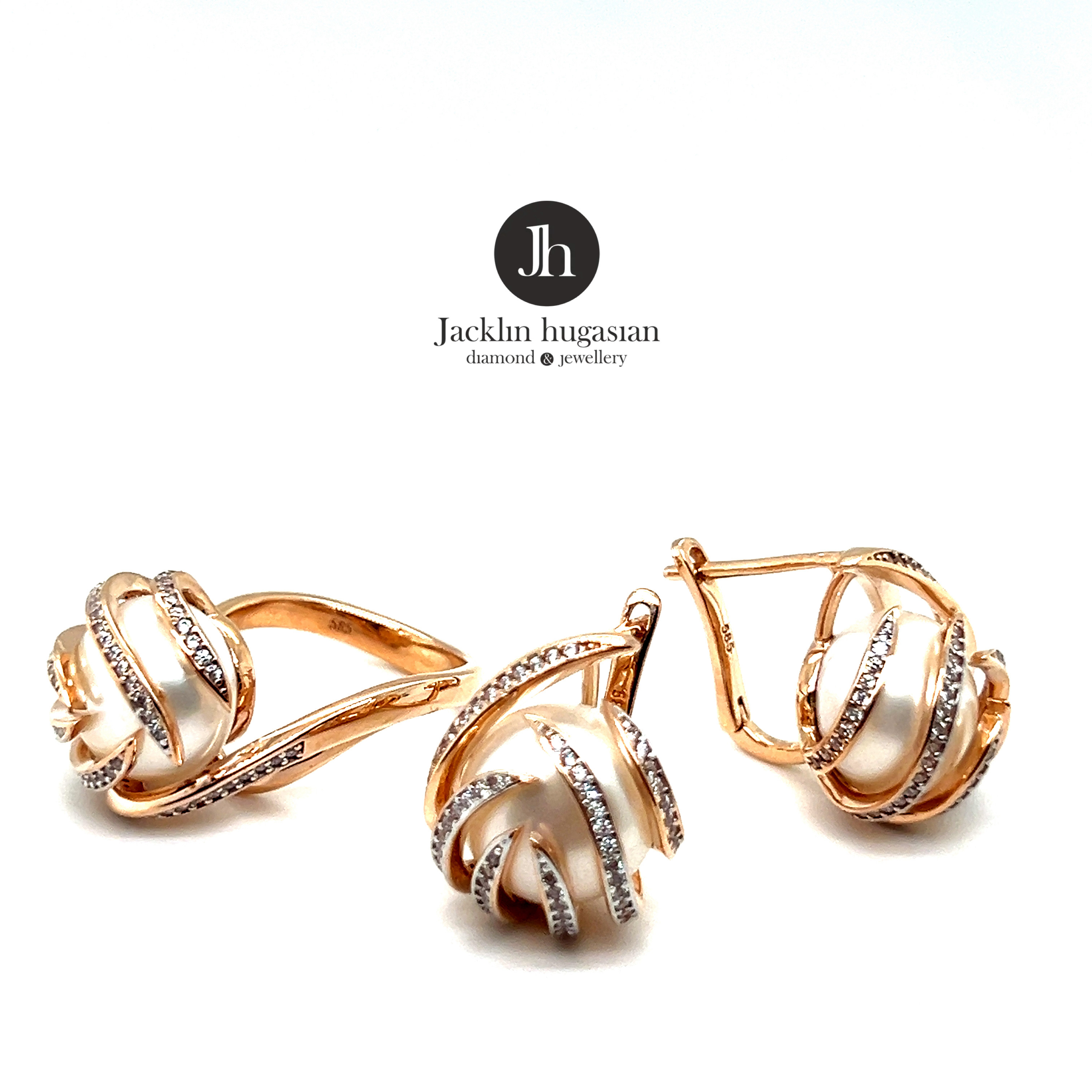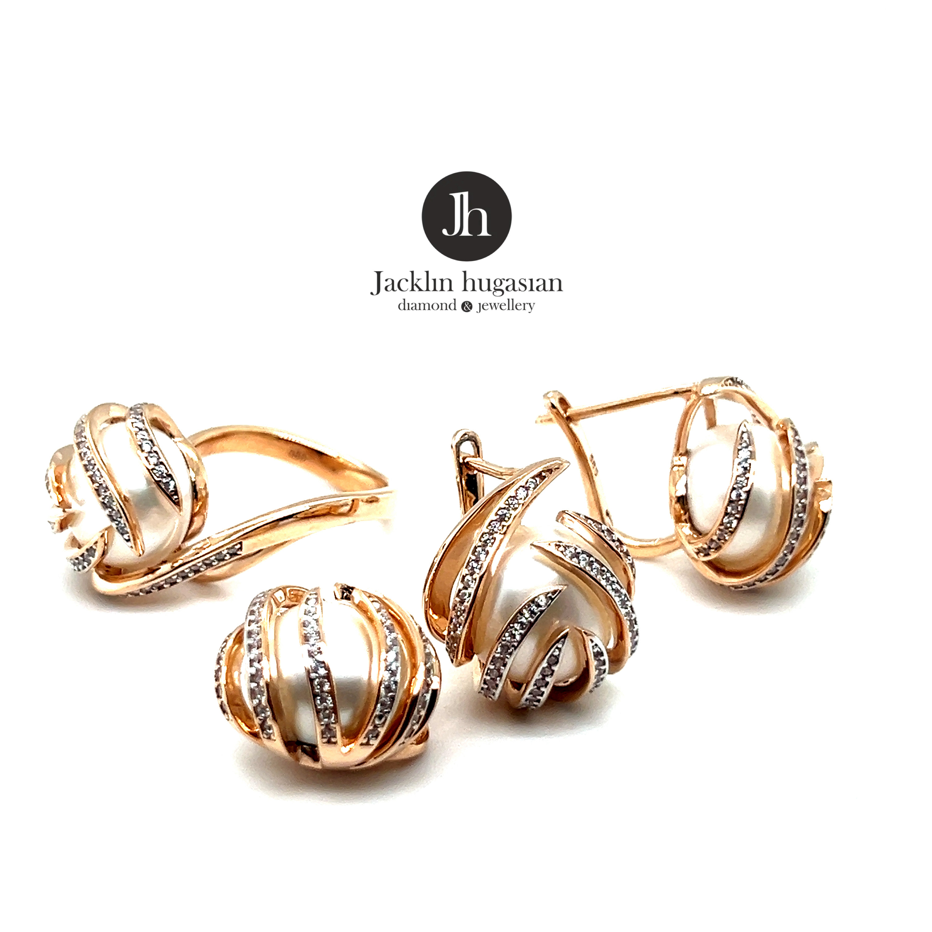 Комплект от “Jacklin hugasian” в розово злато с перли и циркони.