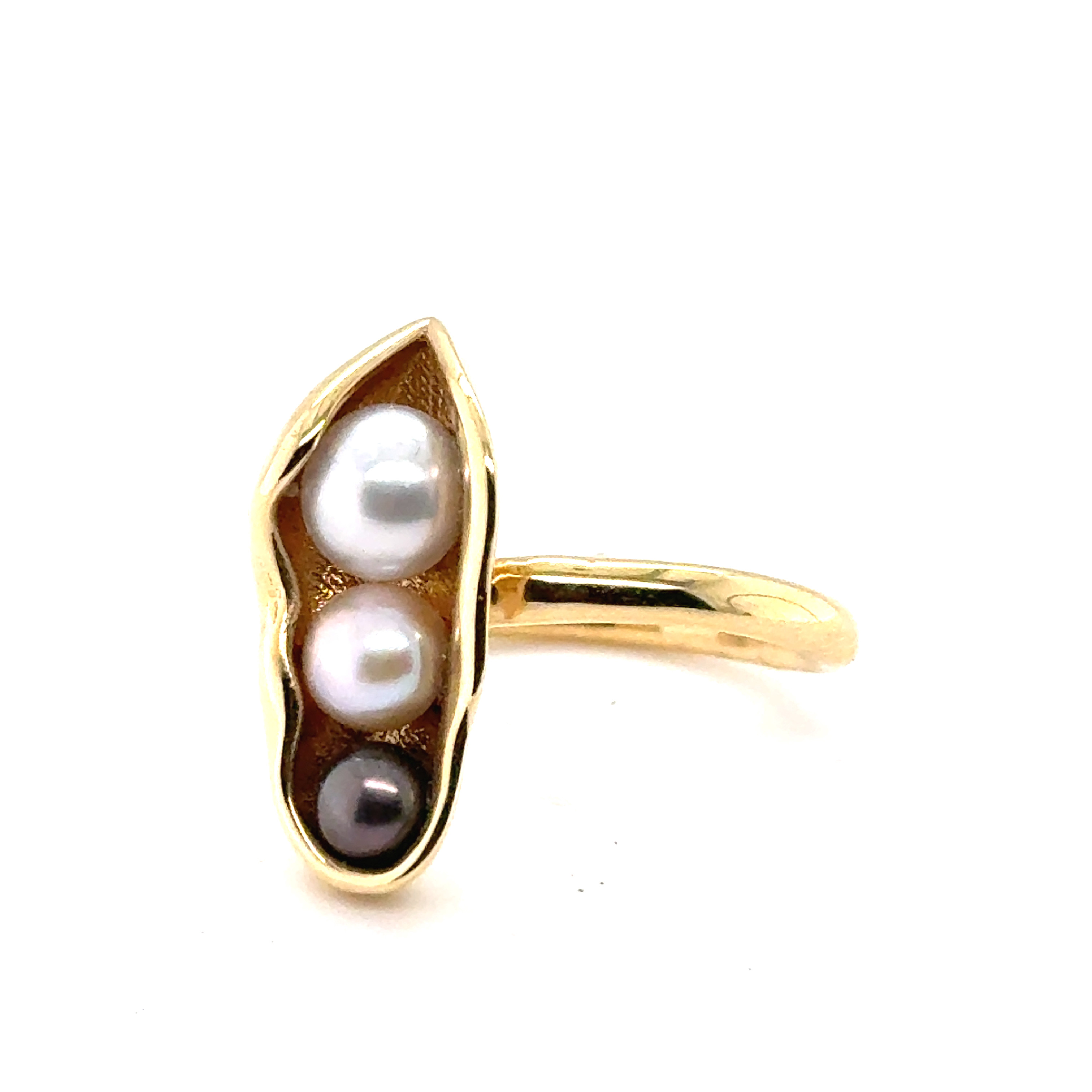 Пръстен от “Jacklin hugasian” в жълто злато с тъмна, бяла и розова перла .