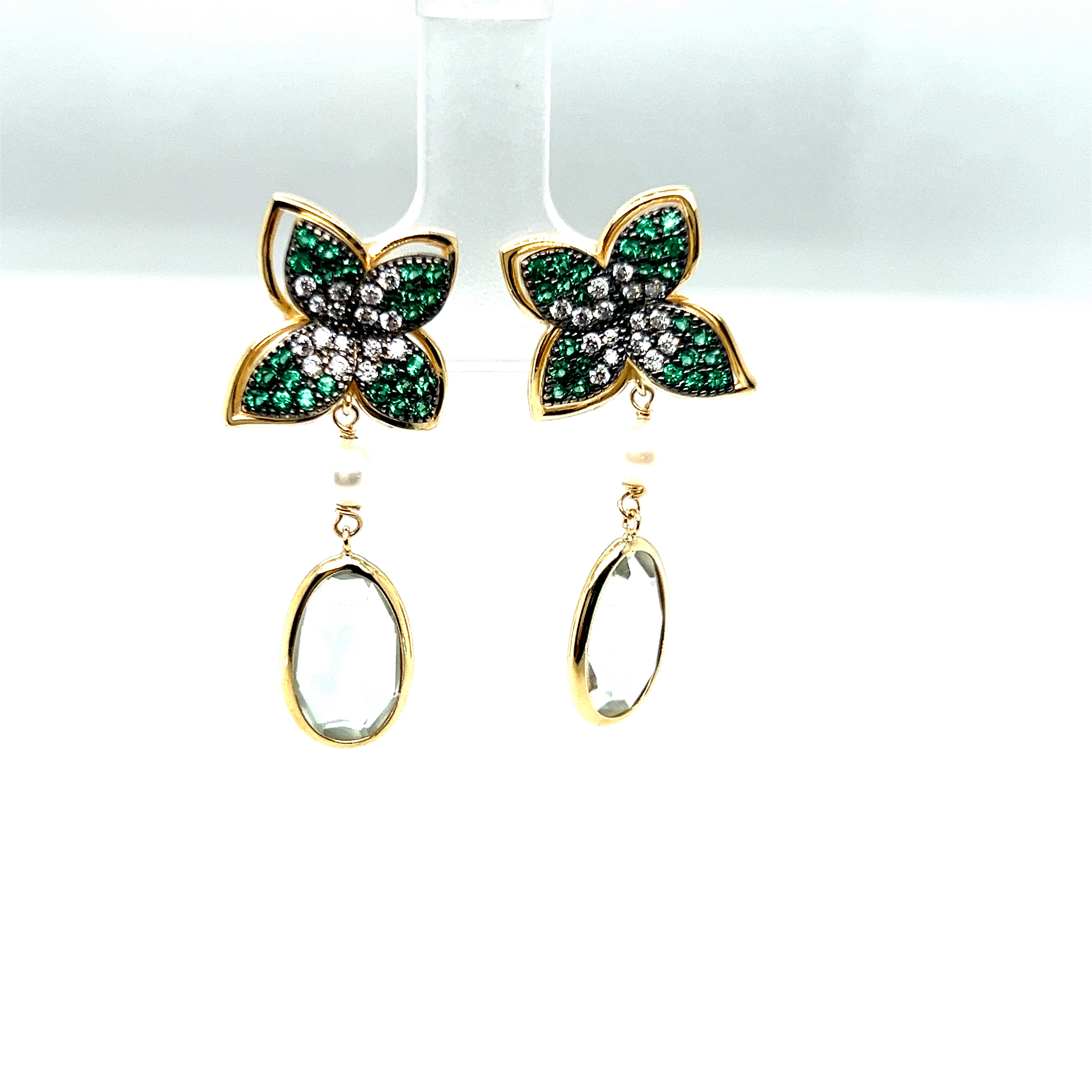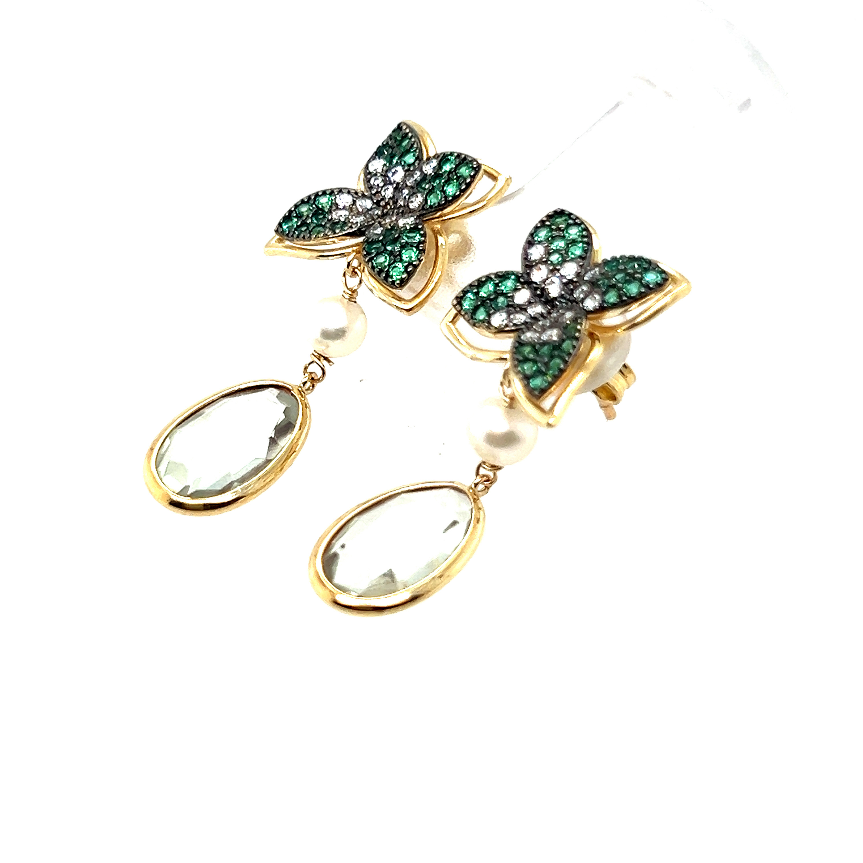 Обеци от “Jacklin hugasian” в жълто злато с перла,аквамарин,турмалин и циркони.