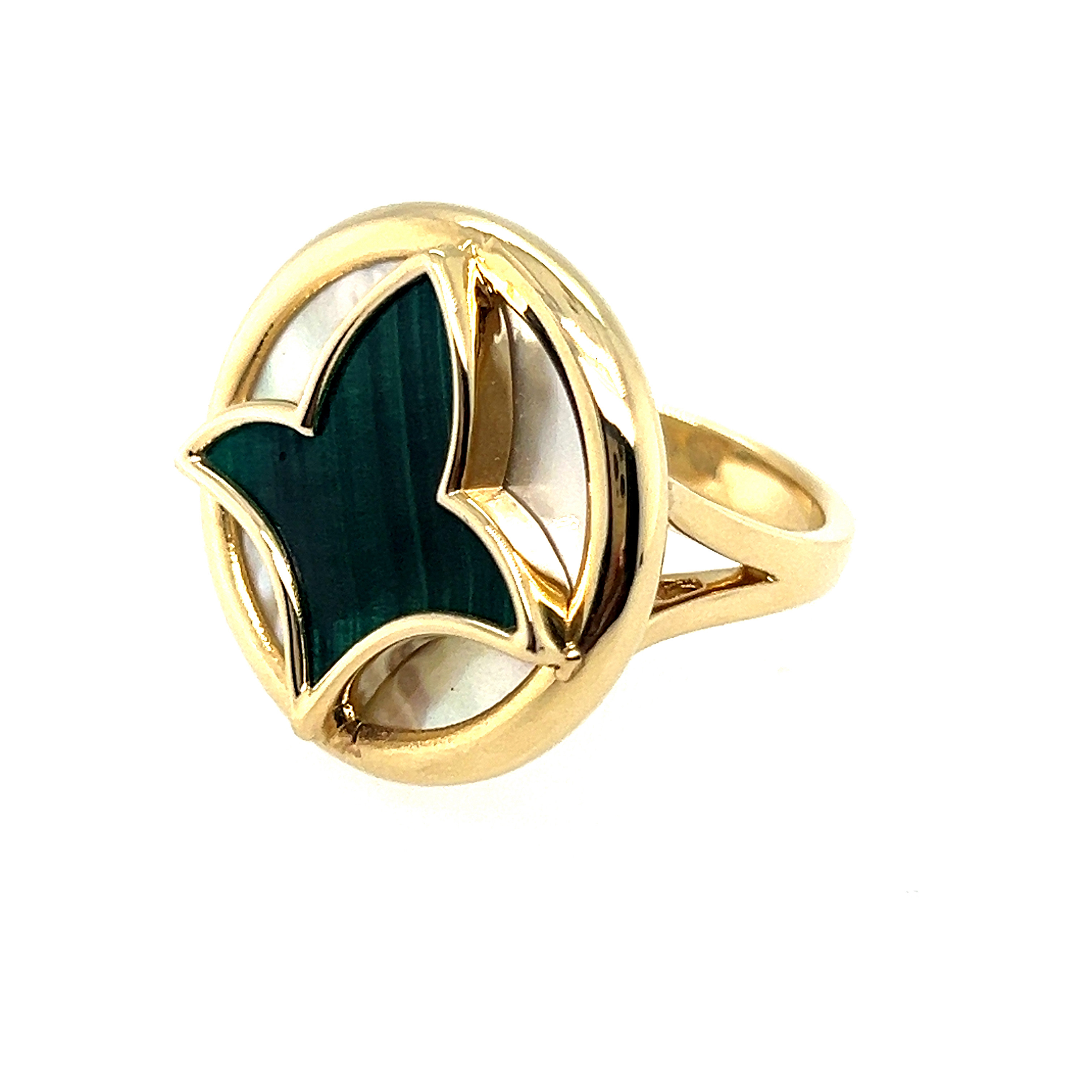Пръстeн от “Jacklin hugasian” в жълто злато със седеф и малахит/ оникс и тюркоаз