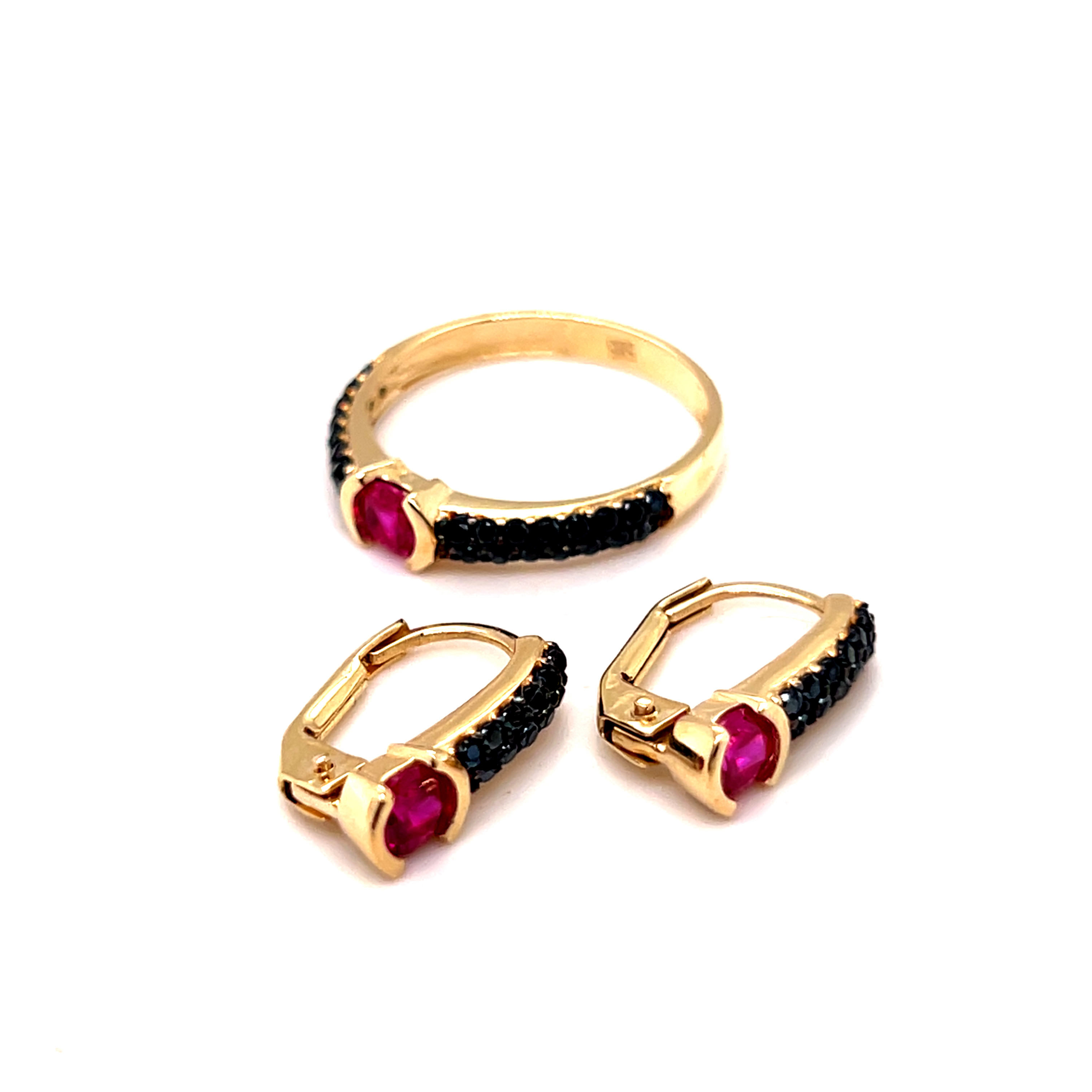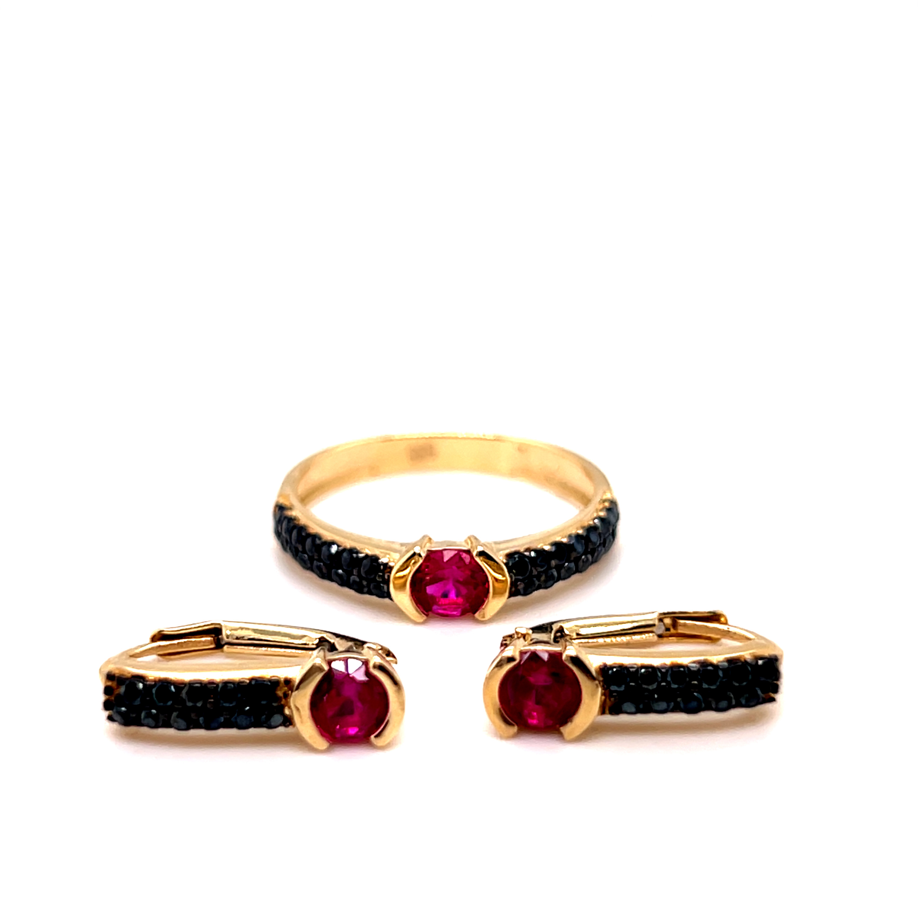 Комплект обеци и пръстен от “Jacklin hugasian” в жълто злато с оникс и рубин