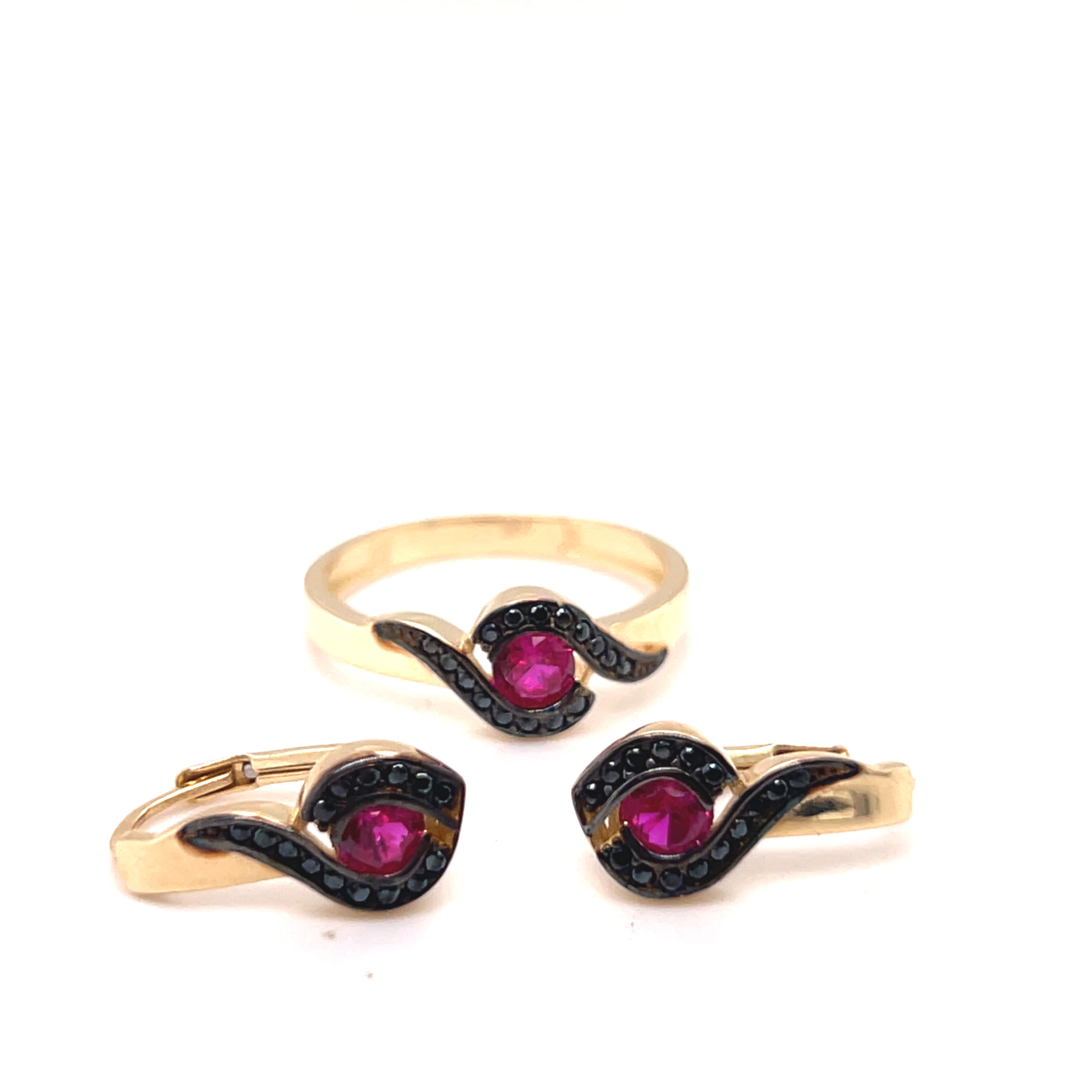 Комплект обеци и пръстен от “Jacklin hugasian” в жълто злато с оникс и синтетичен рубин