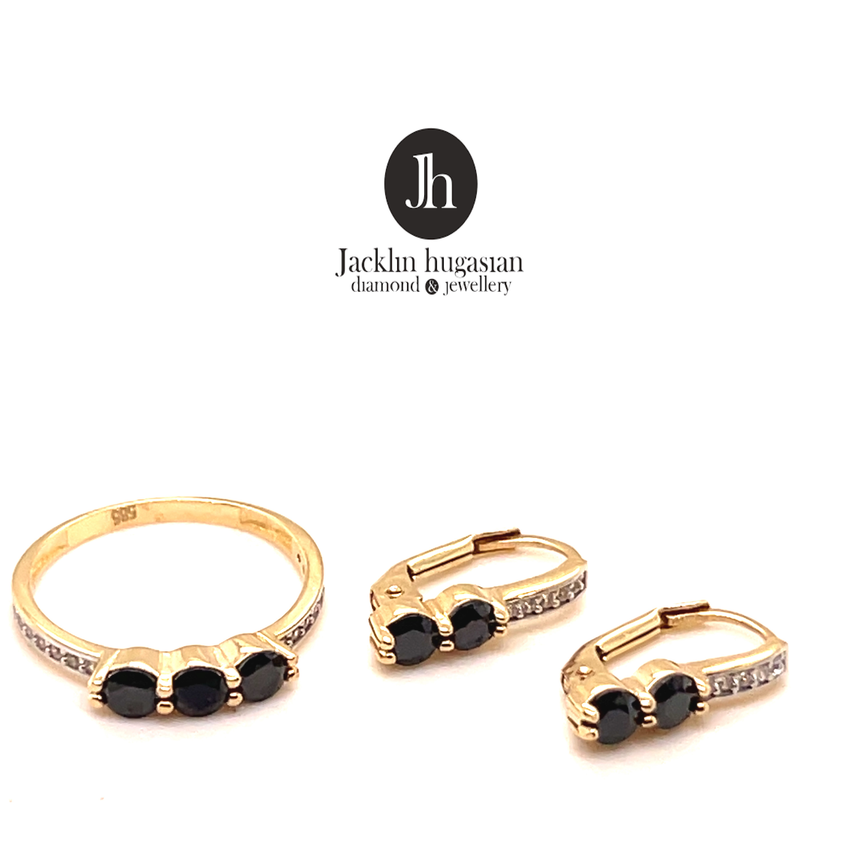 Комплект обеци и пръстен от “Jacklin hugasian” в жълто злато с оникс и циркони
