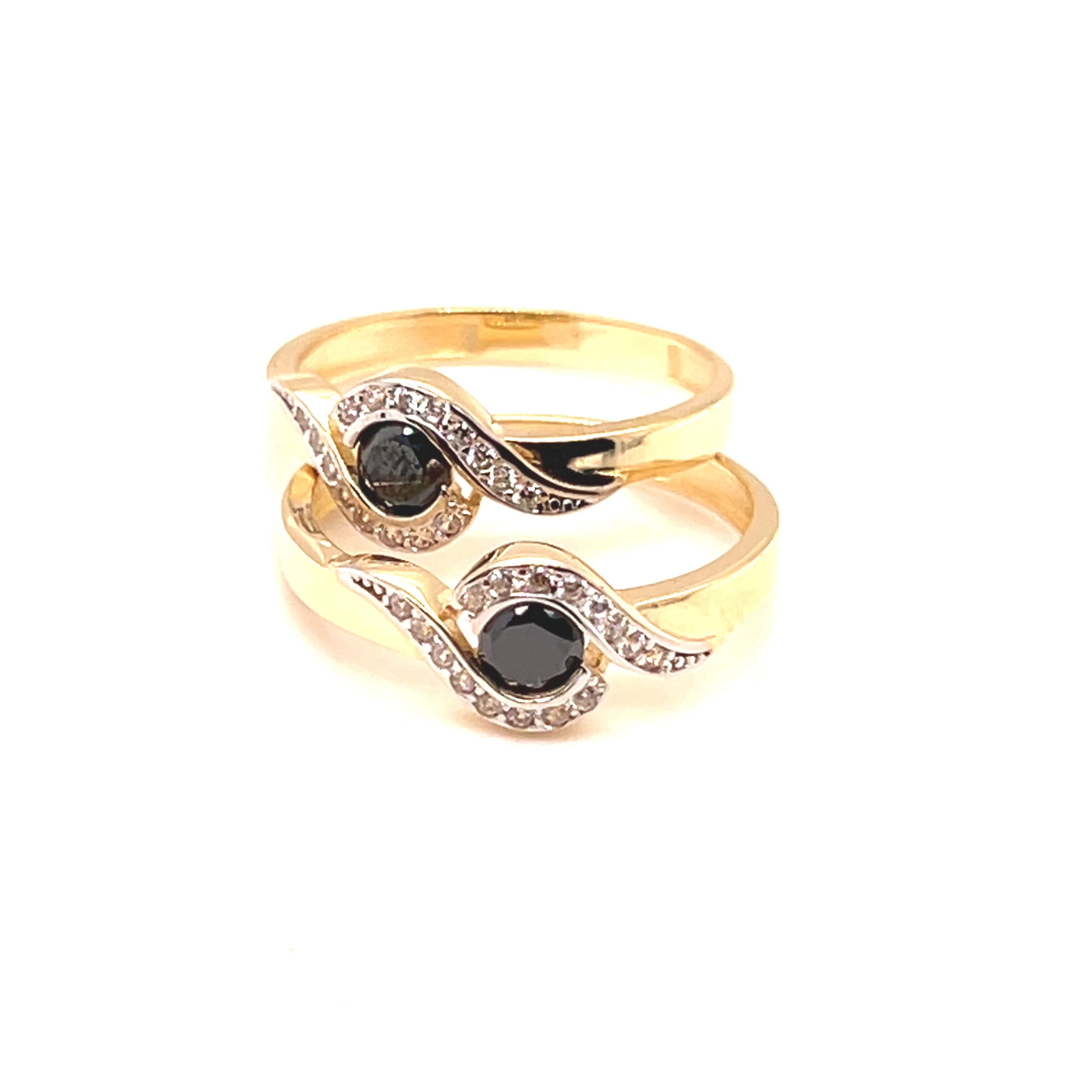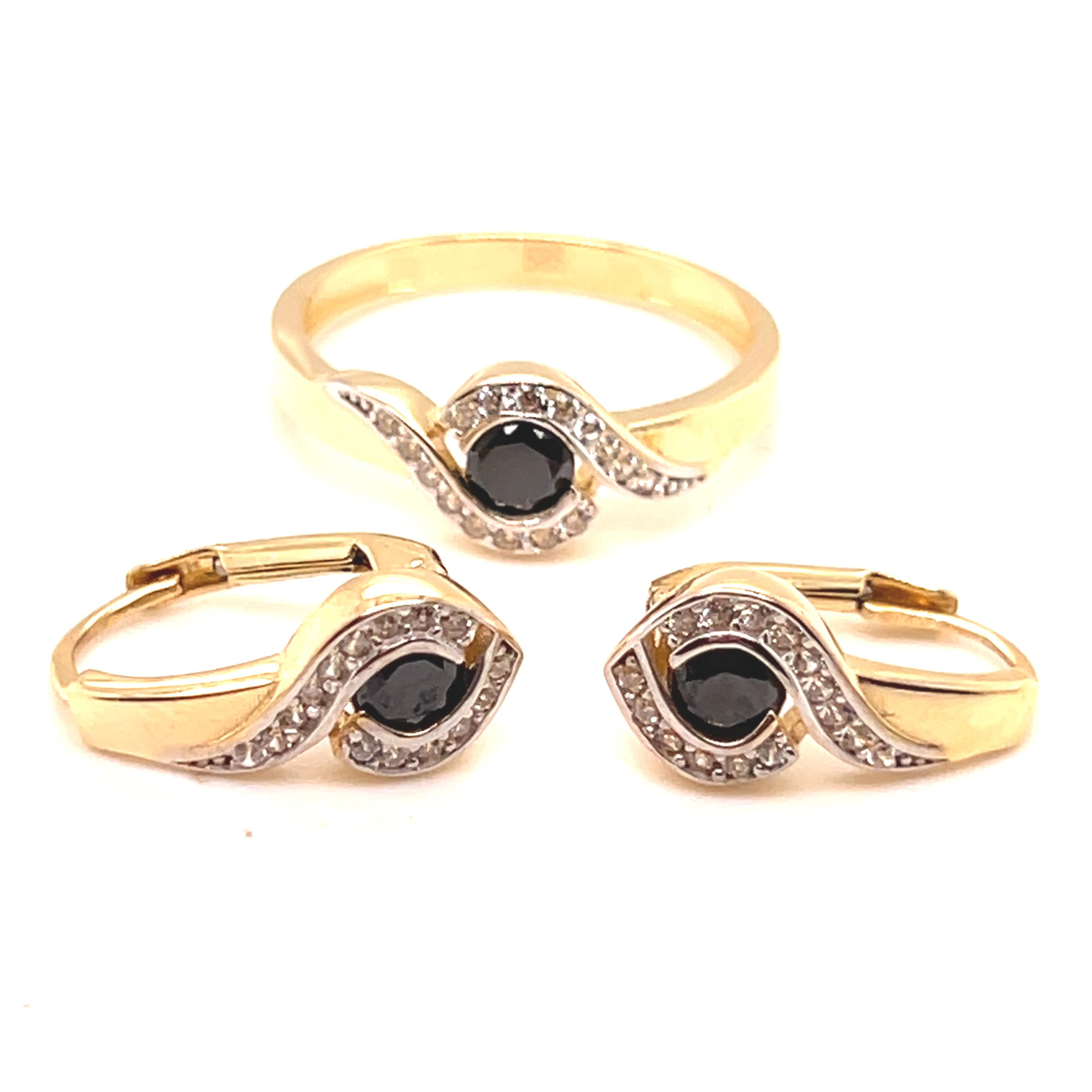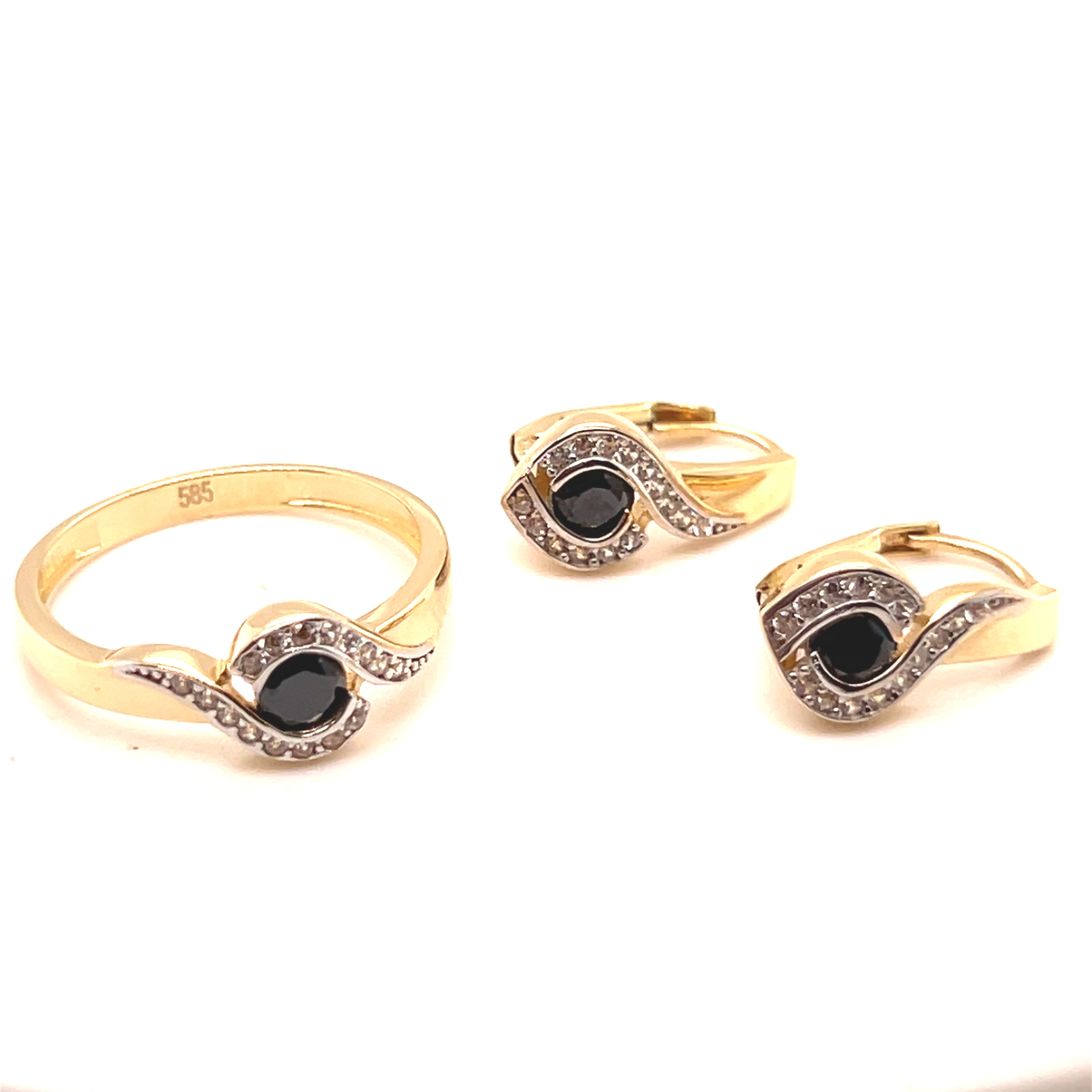 Комплект обеци и пръстен от “Jacklin hugasian” в жълто злато с оникс и циркони