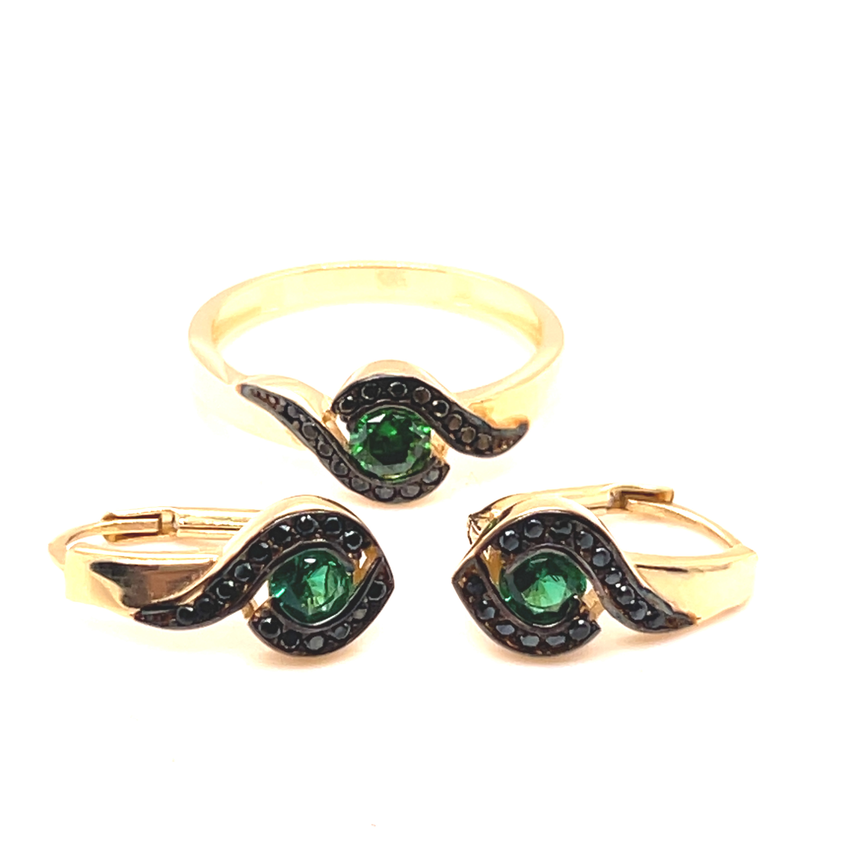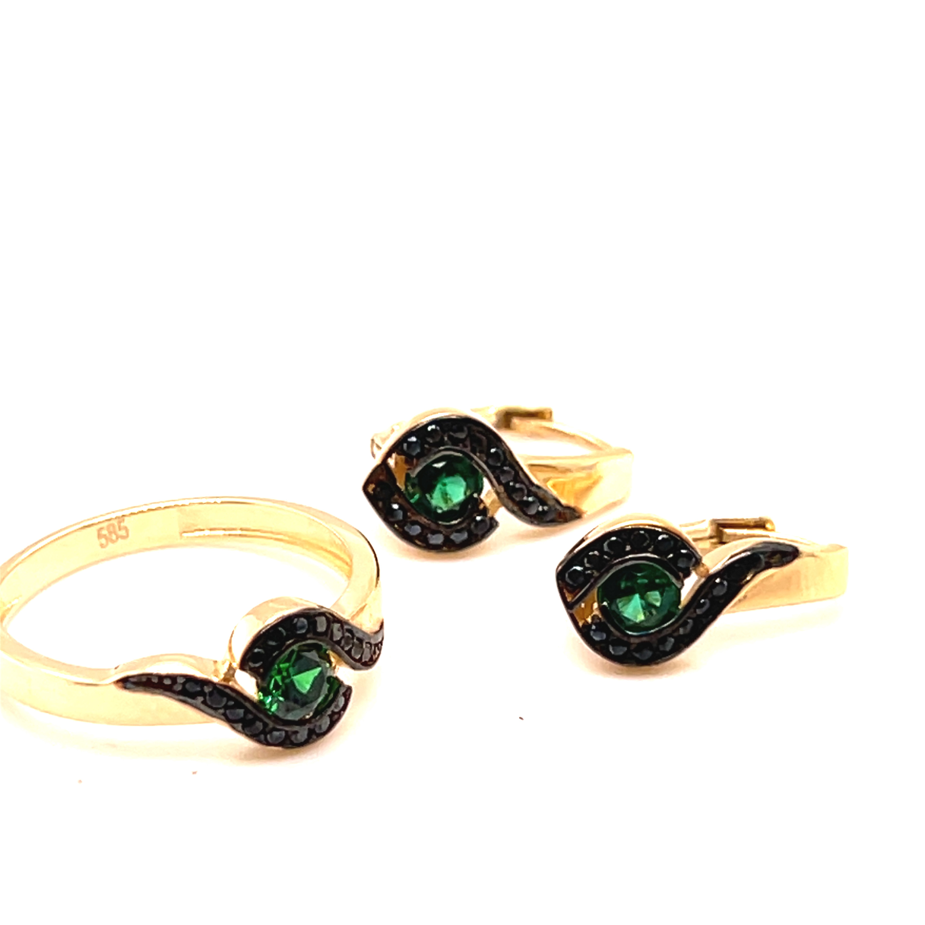 Комплект обеци и пръстен от “Jacklin hugasian” в жълто злато с оникс и синтетичен изумруд
