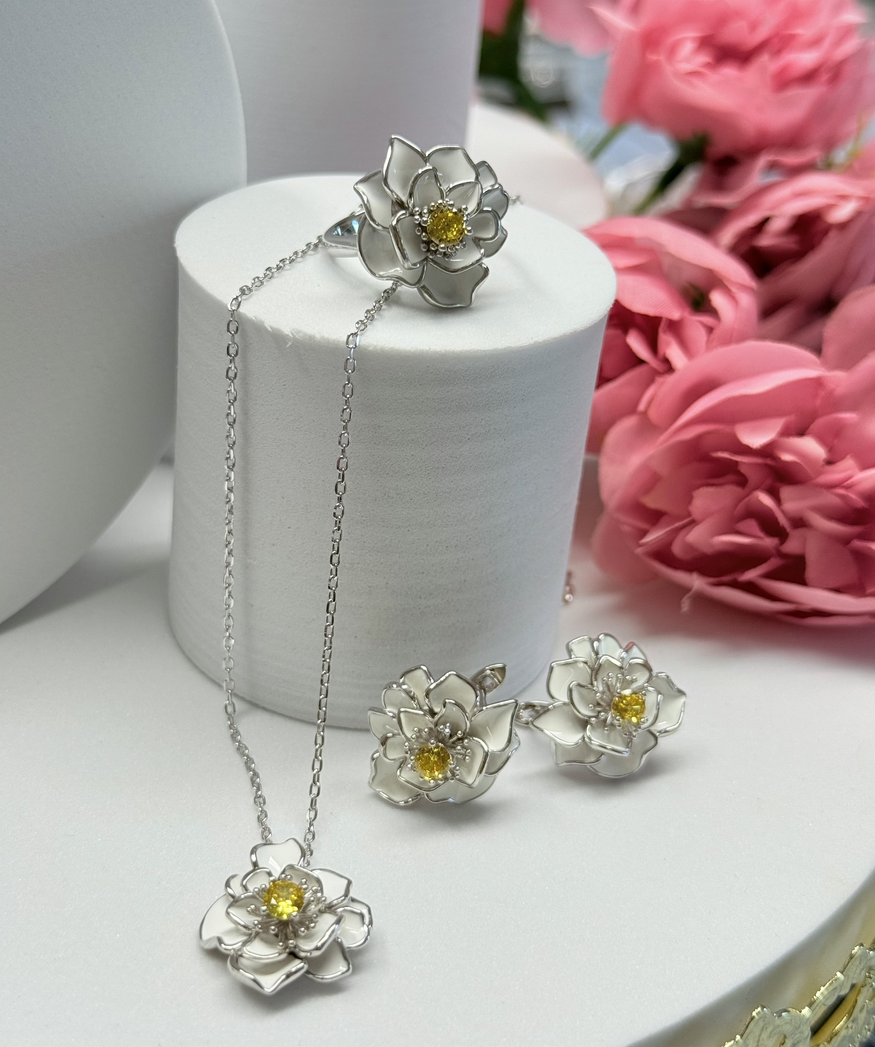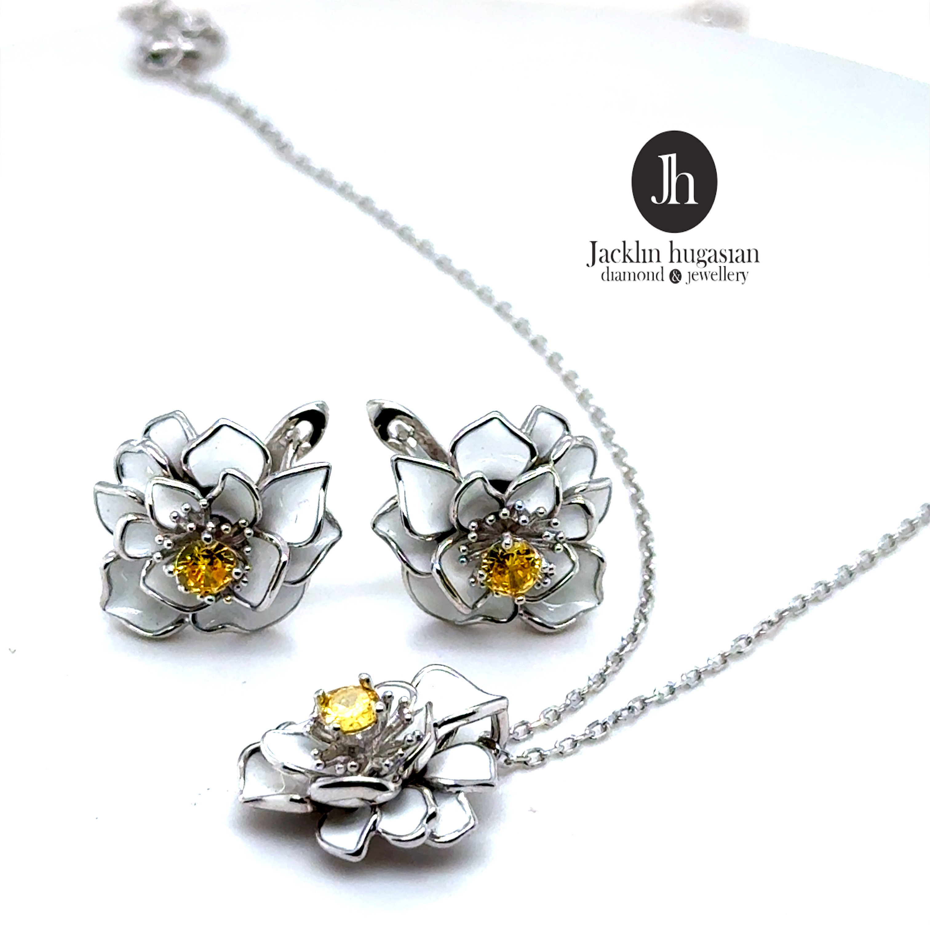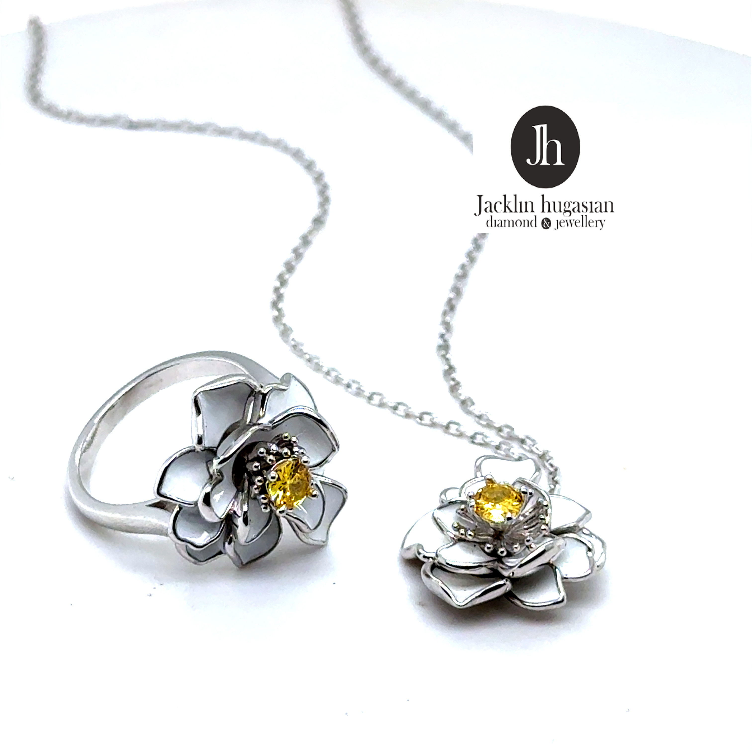 Комплект колие, обеци и пръстен от “Jacklin hugasian” в сребро с цитрин и емайл.