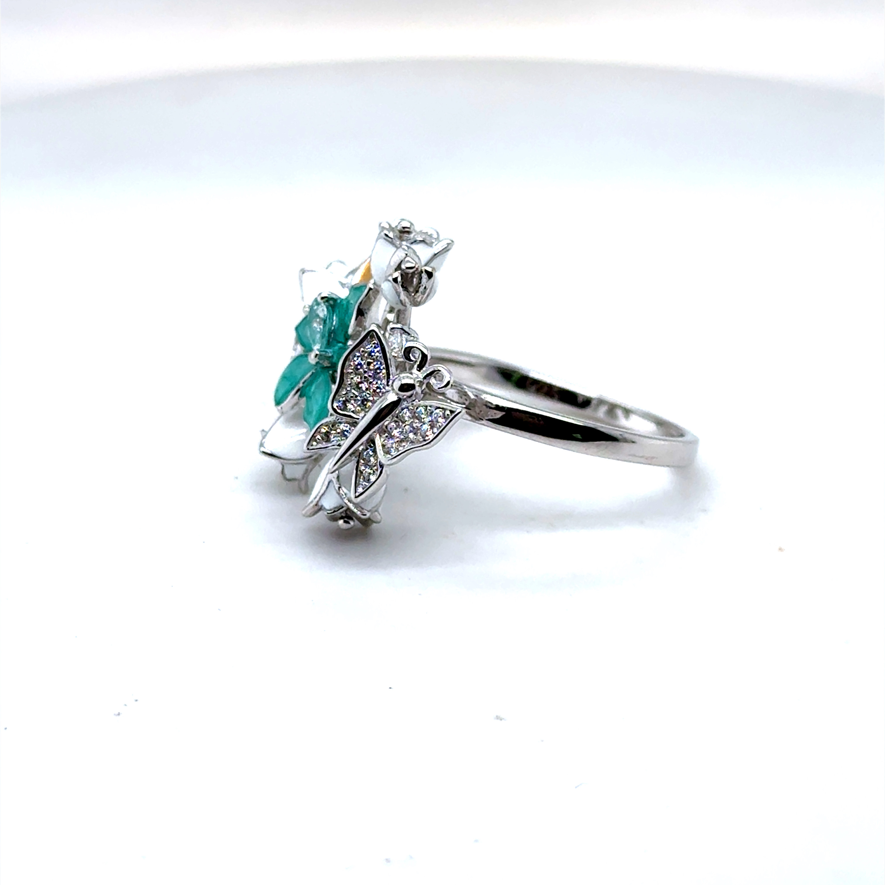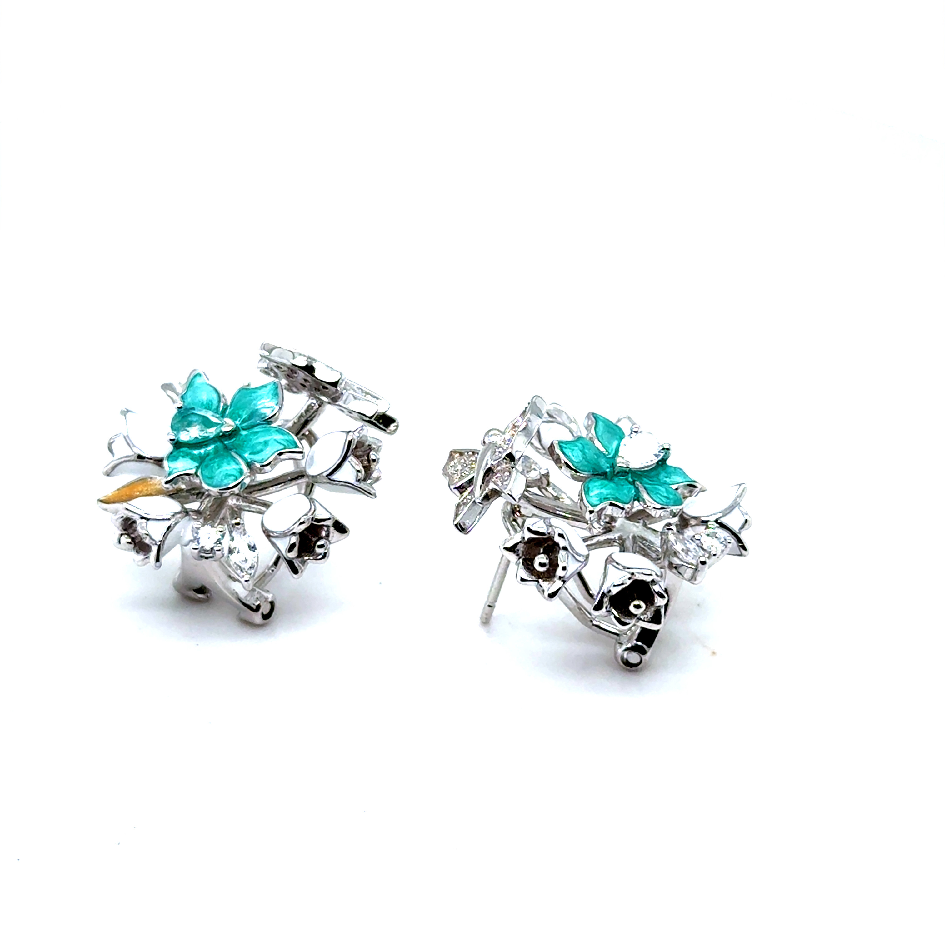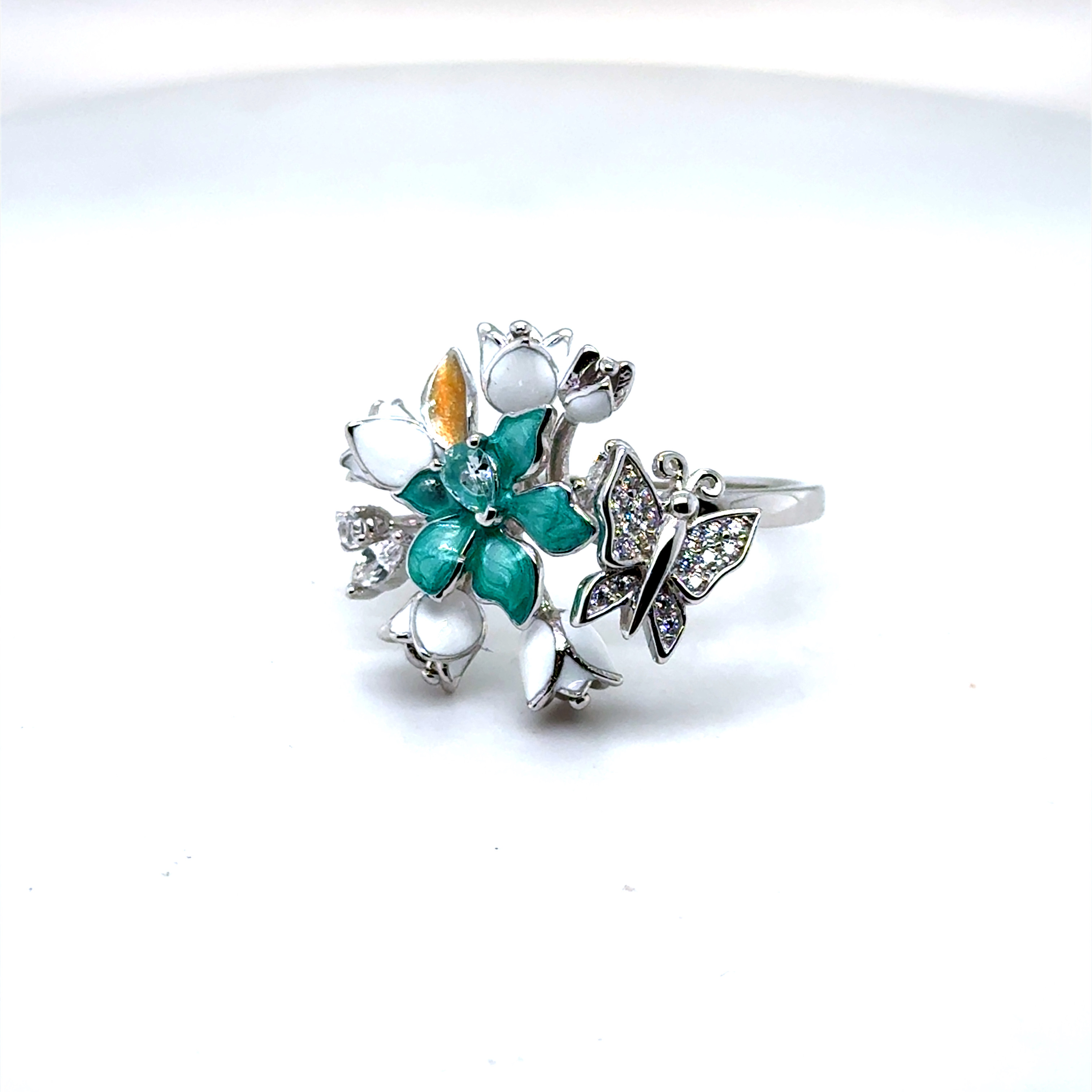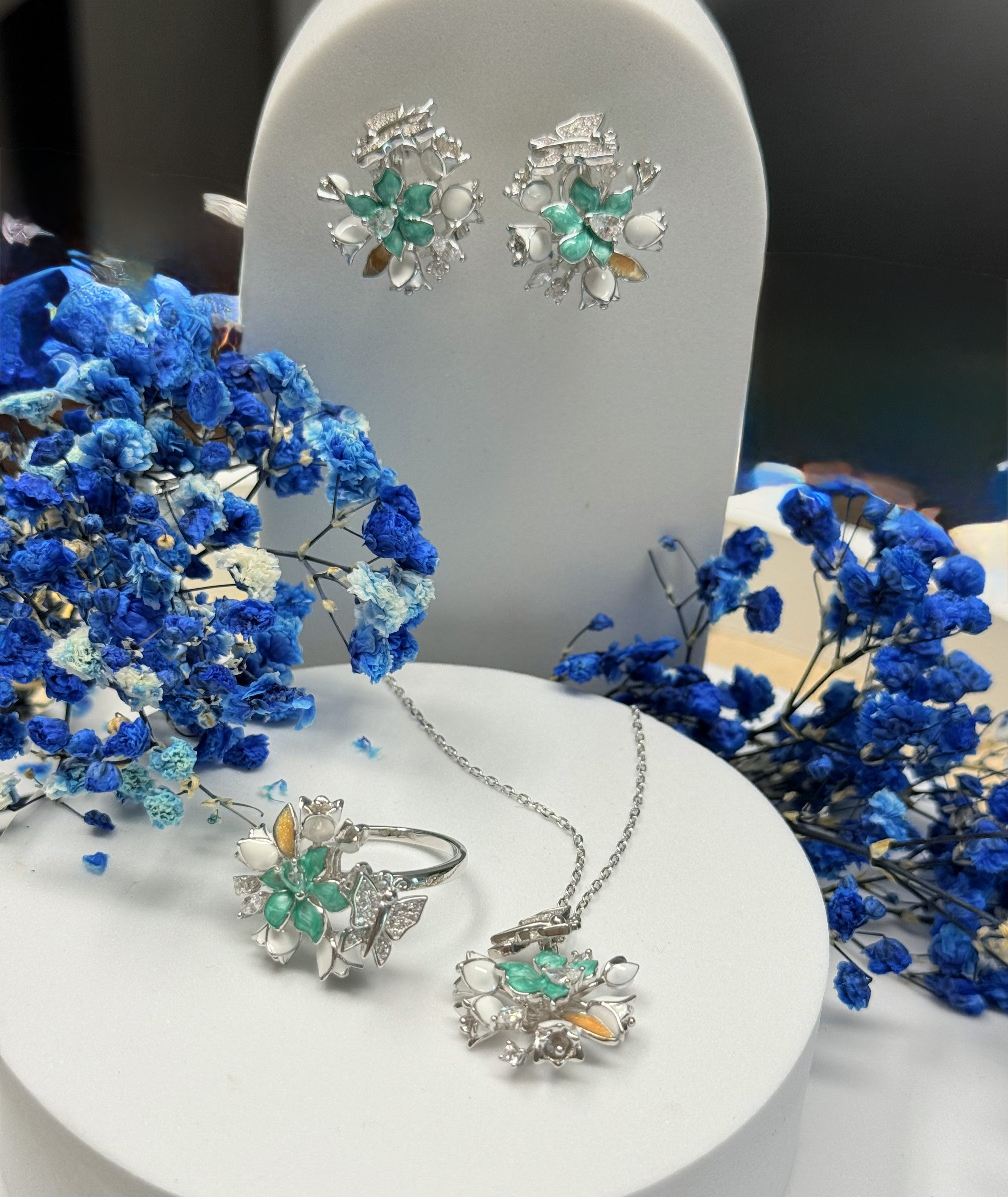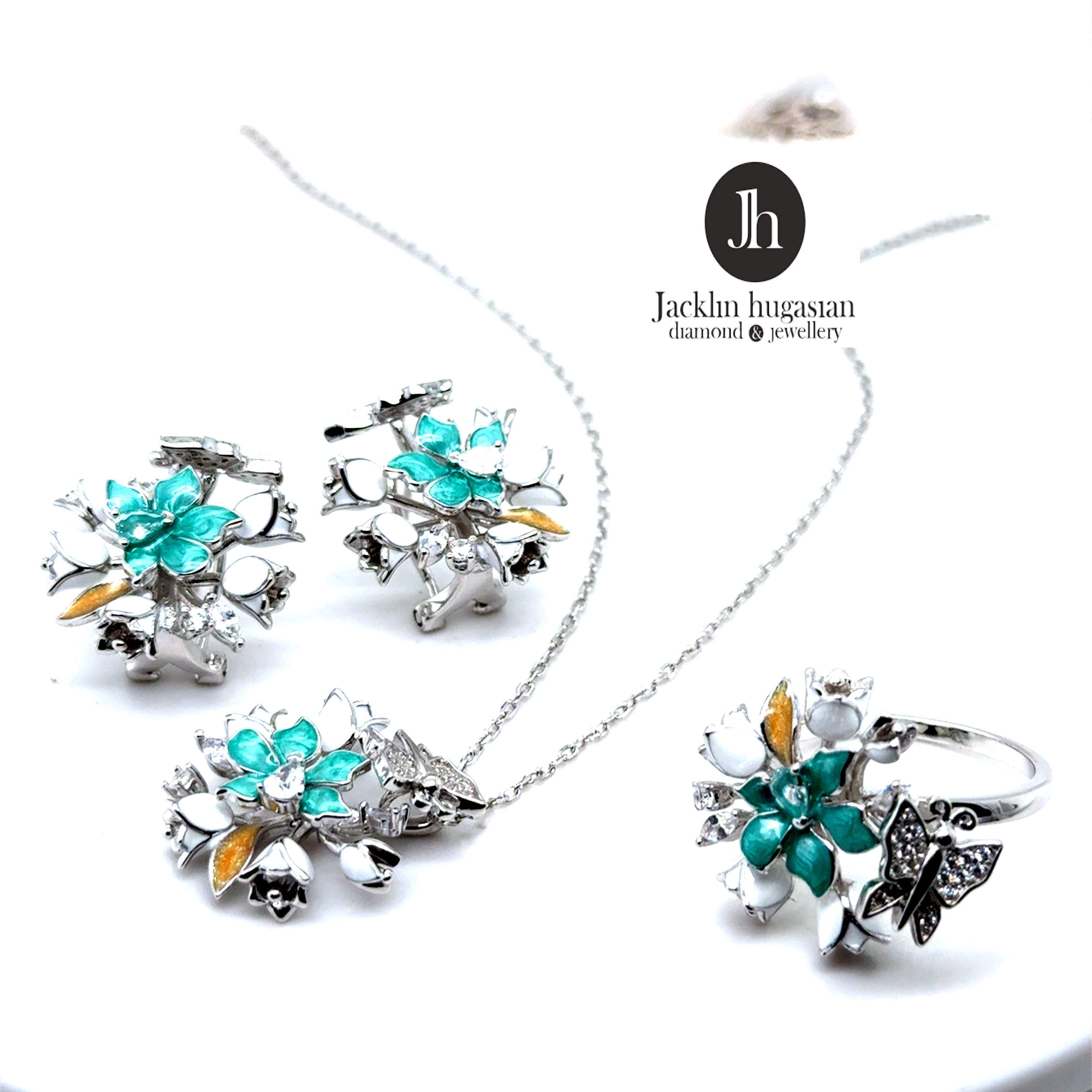 Комплект колие, обеци и пръстен от “Jacklin hugasian” в сребро с емайл и циркони.