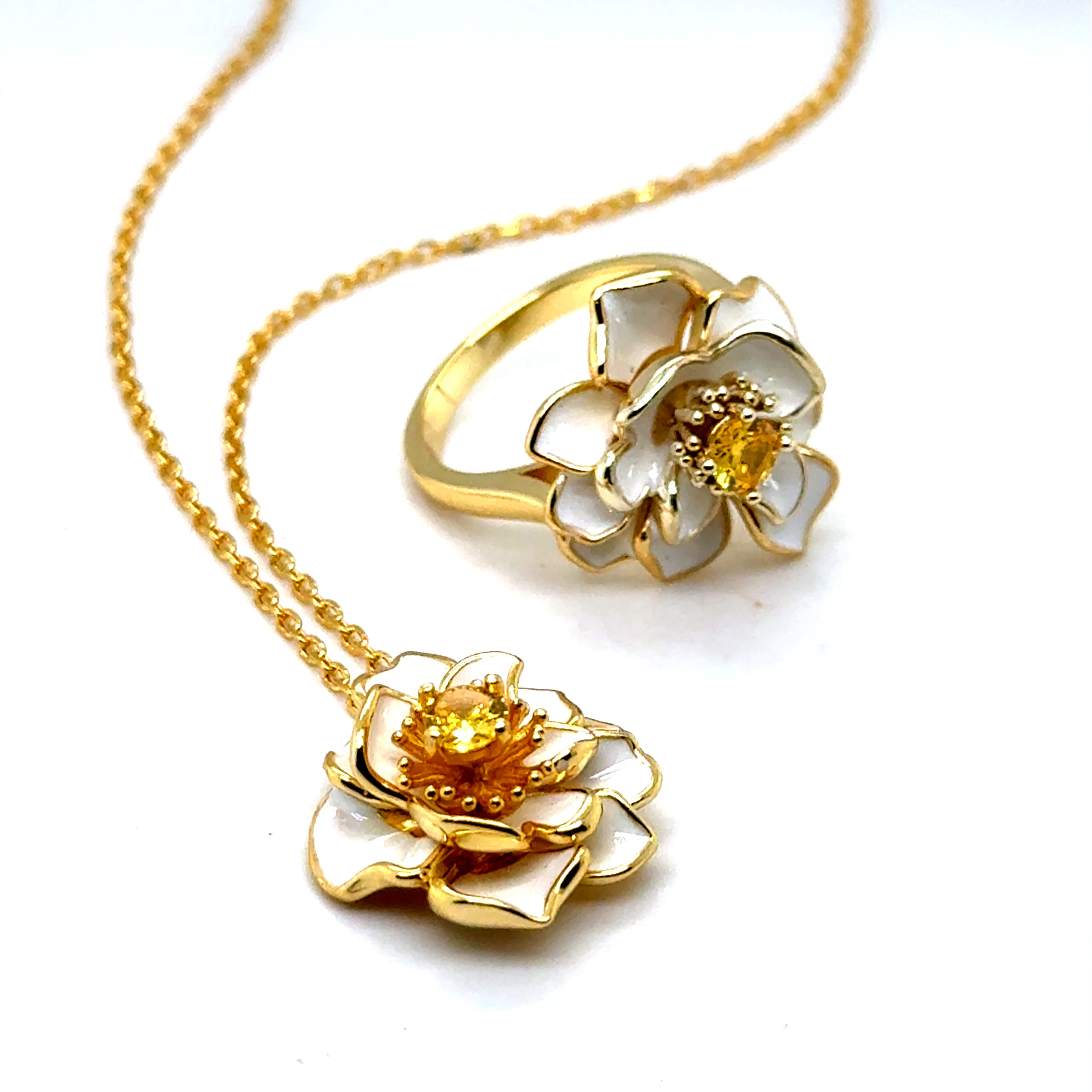 Комплект колие, обеци и пръстен от “Jacklin hugasian” в сребро с позлата с цитрин и емайл.