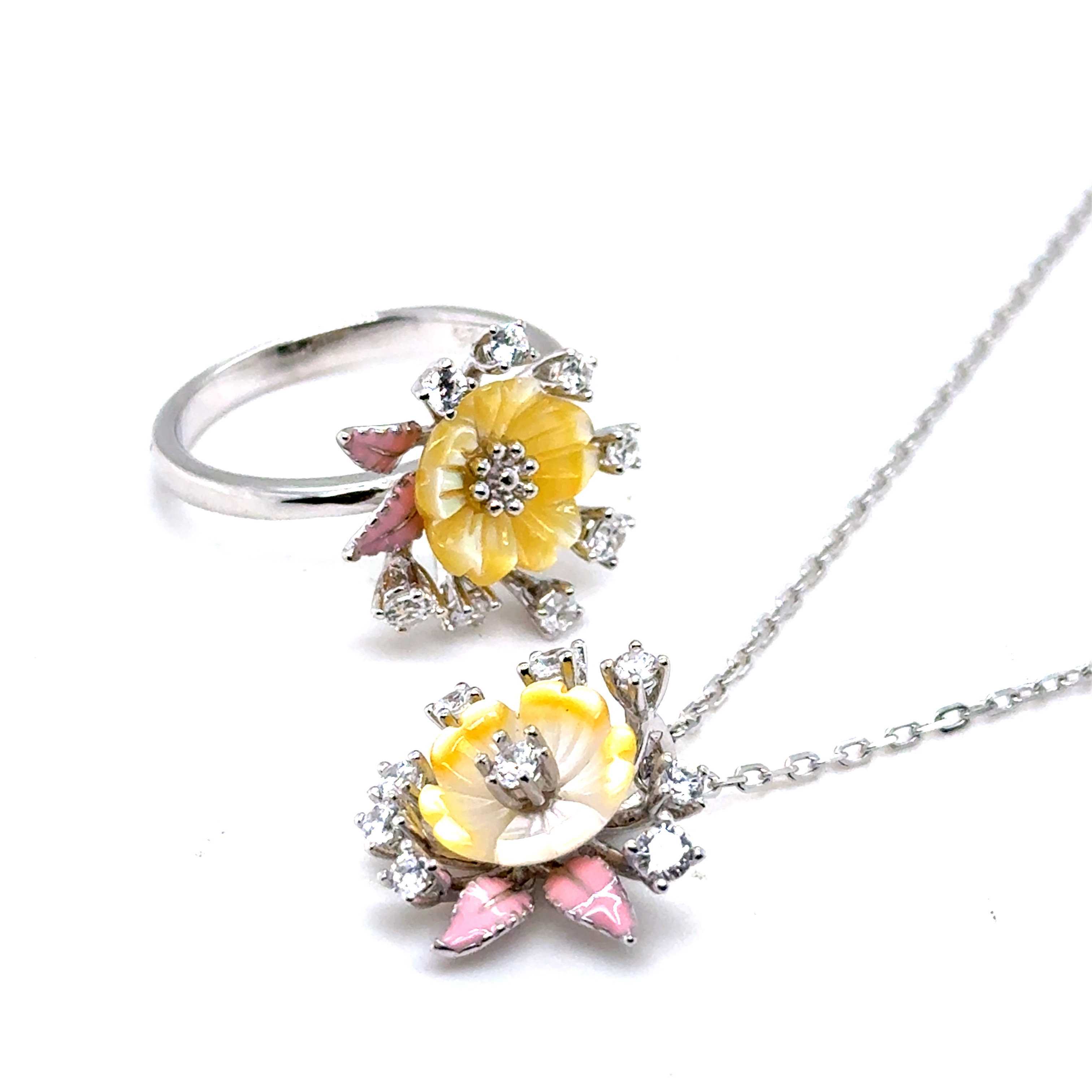 Комплект колие, обеци и пръстен от “Jacklin hugasian” в сребро с циркони, седеф и цветен емайл.