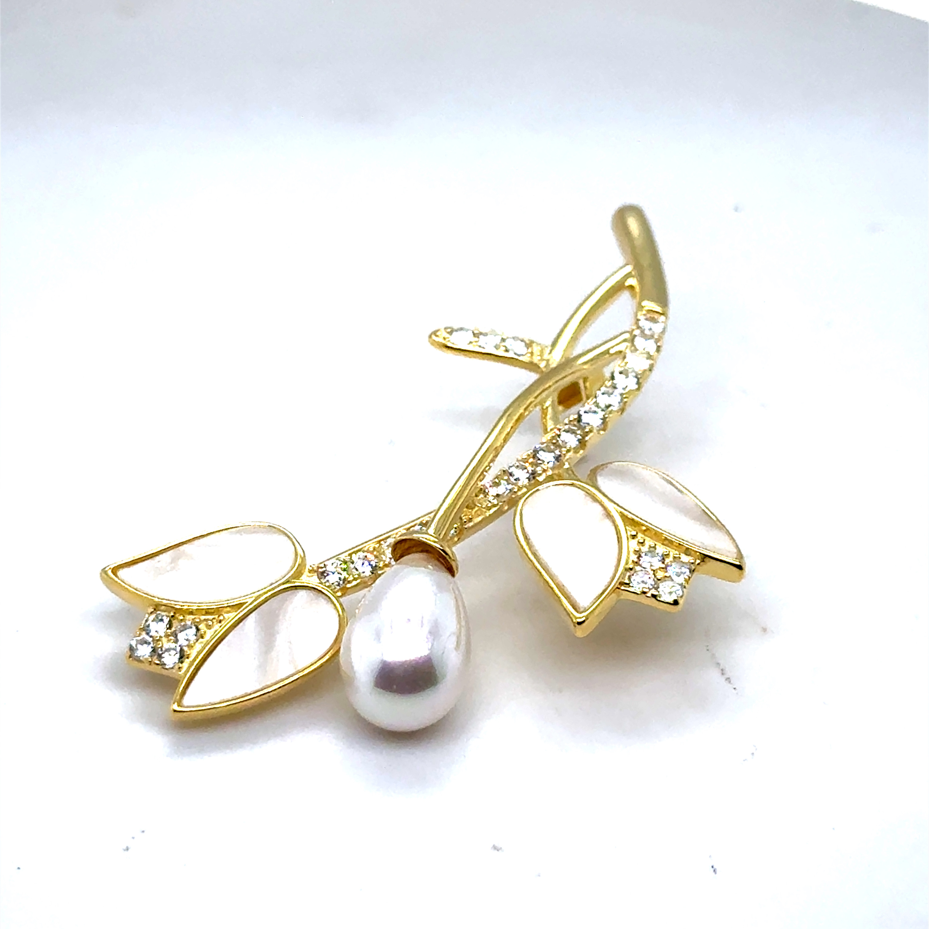 Брошка от ”Jacklin hugasian” в сребро с позлата с естествен седеф,циркони и естествена перла.