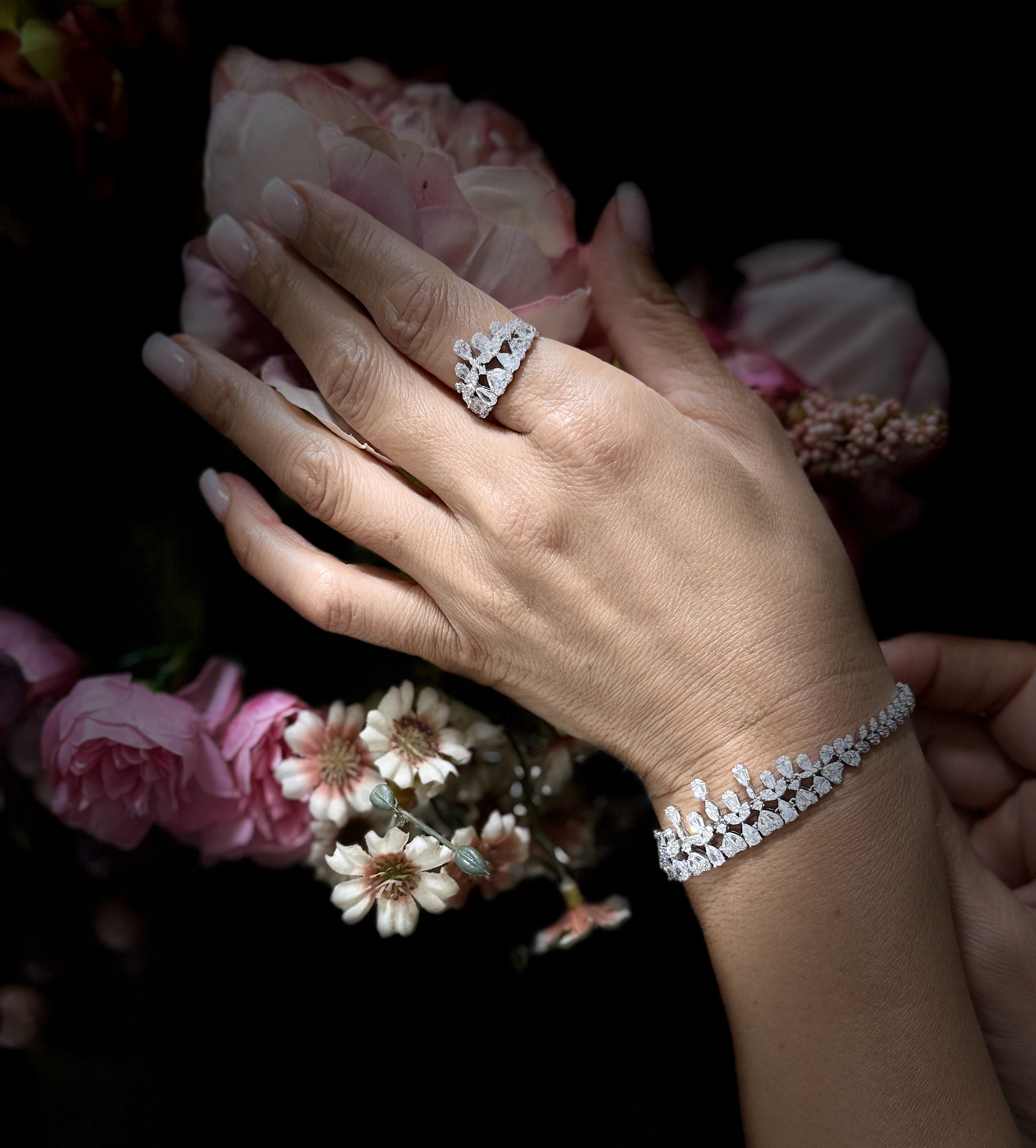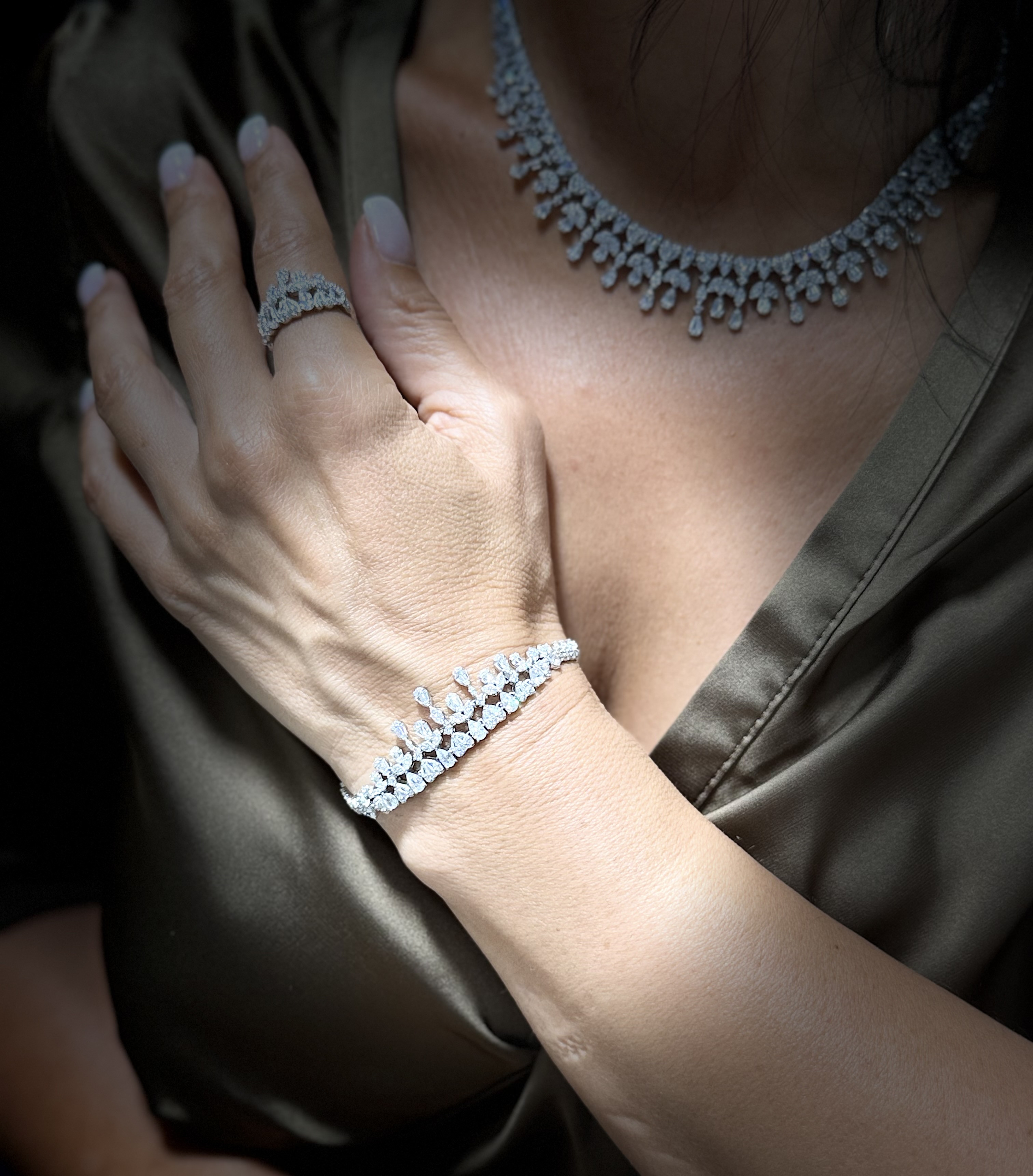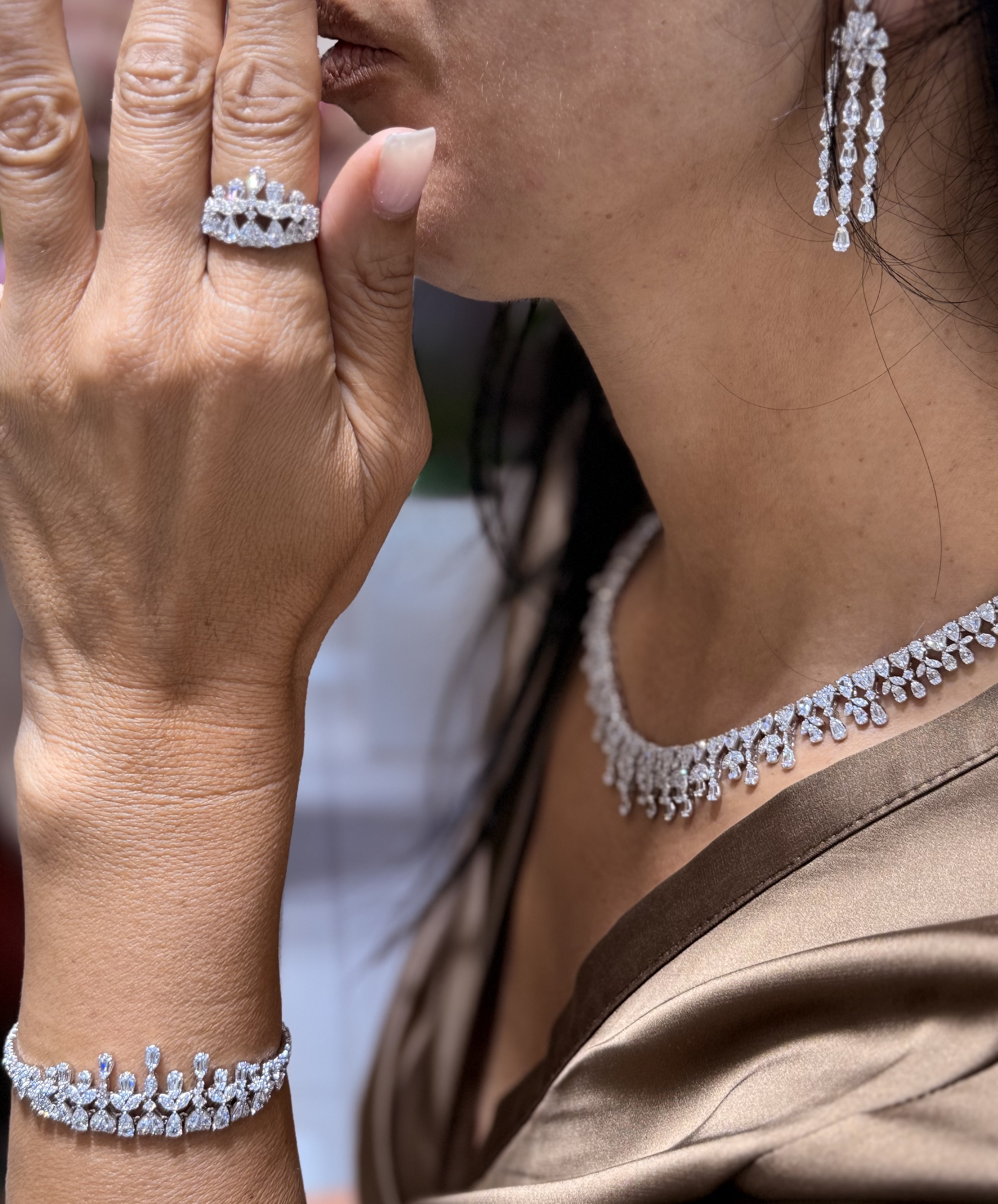 Комплект колие, обеци , пръстен и гривна от “Jacklin hugasian” в сребро с цирконии.