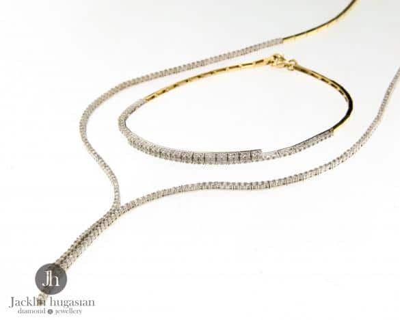 Колие от "Jacklin hugasian" в жълто и бяло злато с цирконии. Дължина колие 45 см.