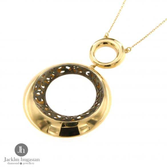 Колие от "Jacklin hugasian" в жълто оксидирано злато гланц. Дължина колие 60 см. Диаметър висулка 3.5 см. Колекция "Yamachi".Произход Италия