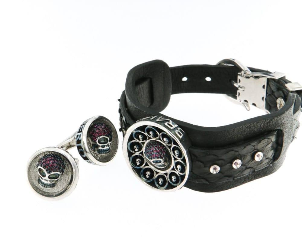 Комплект гривна и ръкавели от "Jacklin hugasian" сребро с позлата,кожа от питон и естествени рубини.