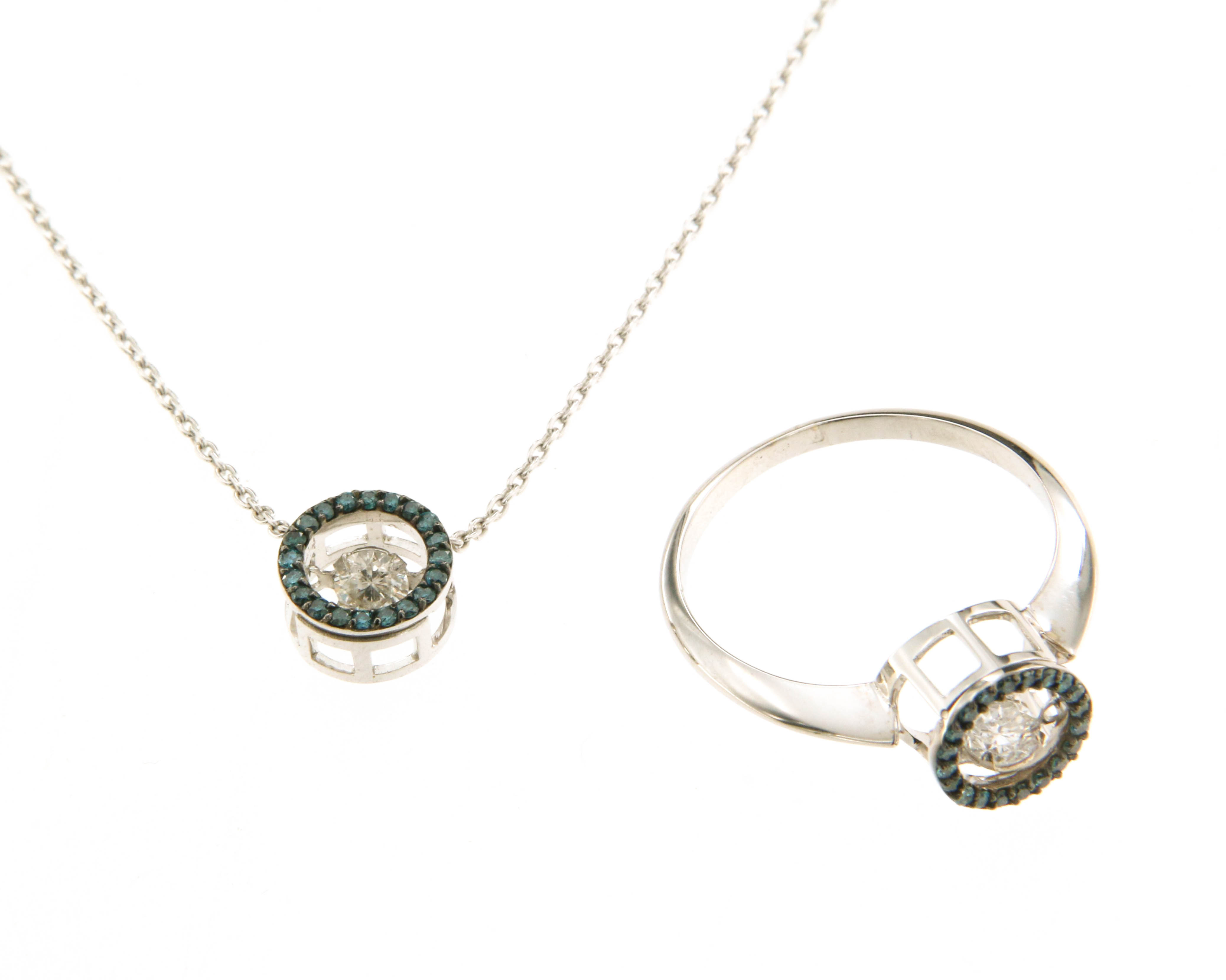 Комплект колие и пръстен от "Jacklin hugasian" в бяло злато с бял диамант и малки сини диаманти.