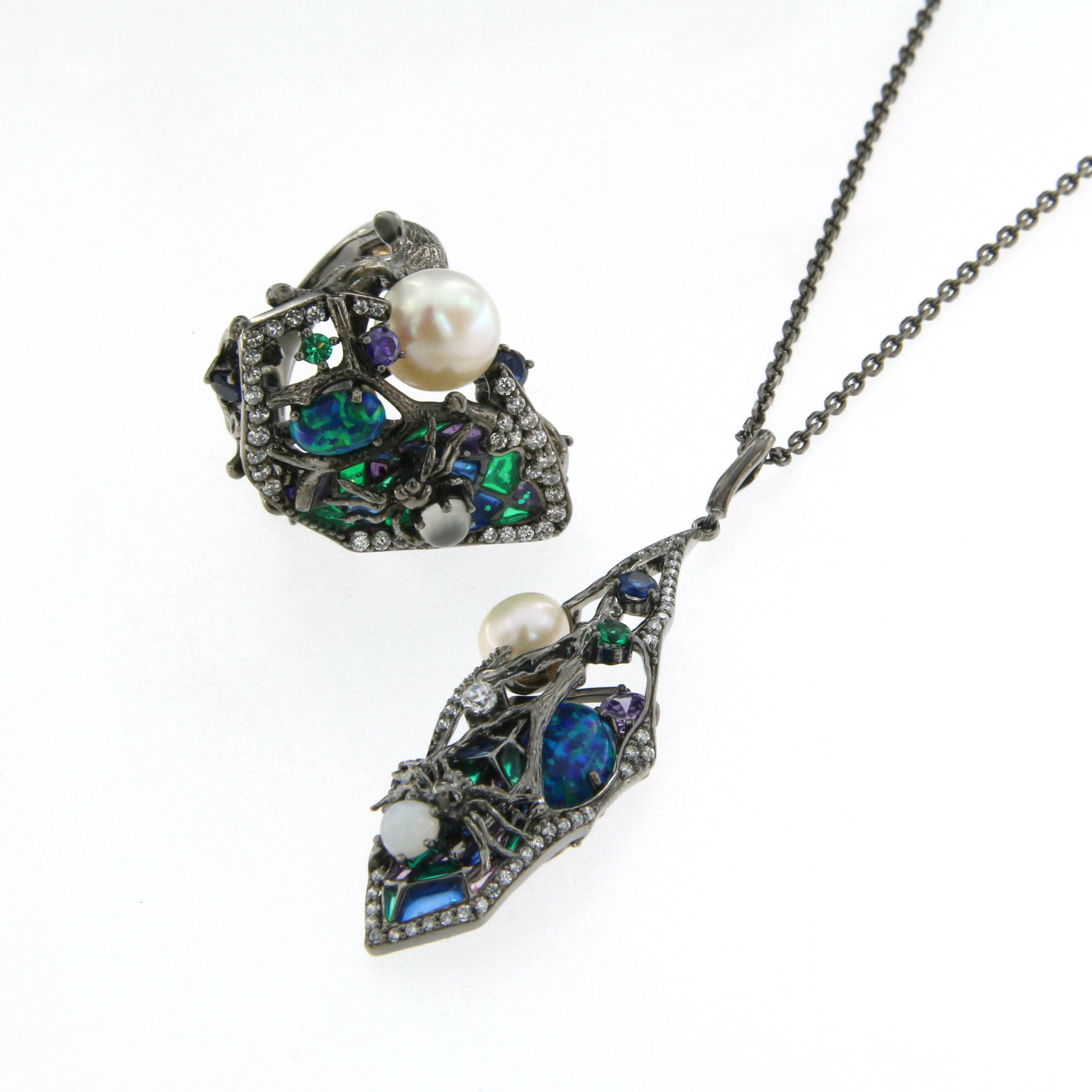 Комплект пръстен и колие от "Jacklin hugasian" в оксидирано сребро с разноцветен емайл с перла, опал, котешко око, изумруд, сапфири, аметист и циркони.