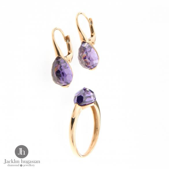 Комплект пръстен и обеци от "Jacklin hugasian" в розово злато, гланц с аметист колекция "ROBERTO BRAVO". Дължина обеци 1.8 см.,широчина обеци 0.8 см 14 К 585 Грам пръстен : 3.40 гр.