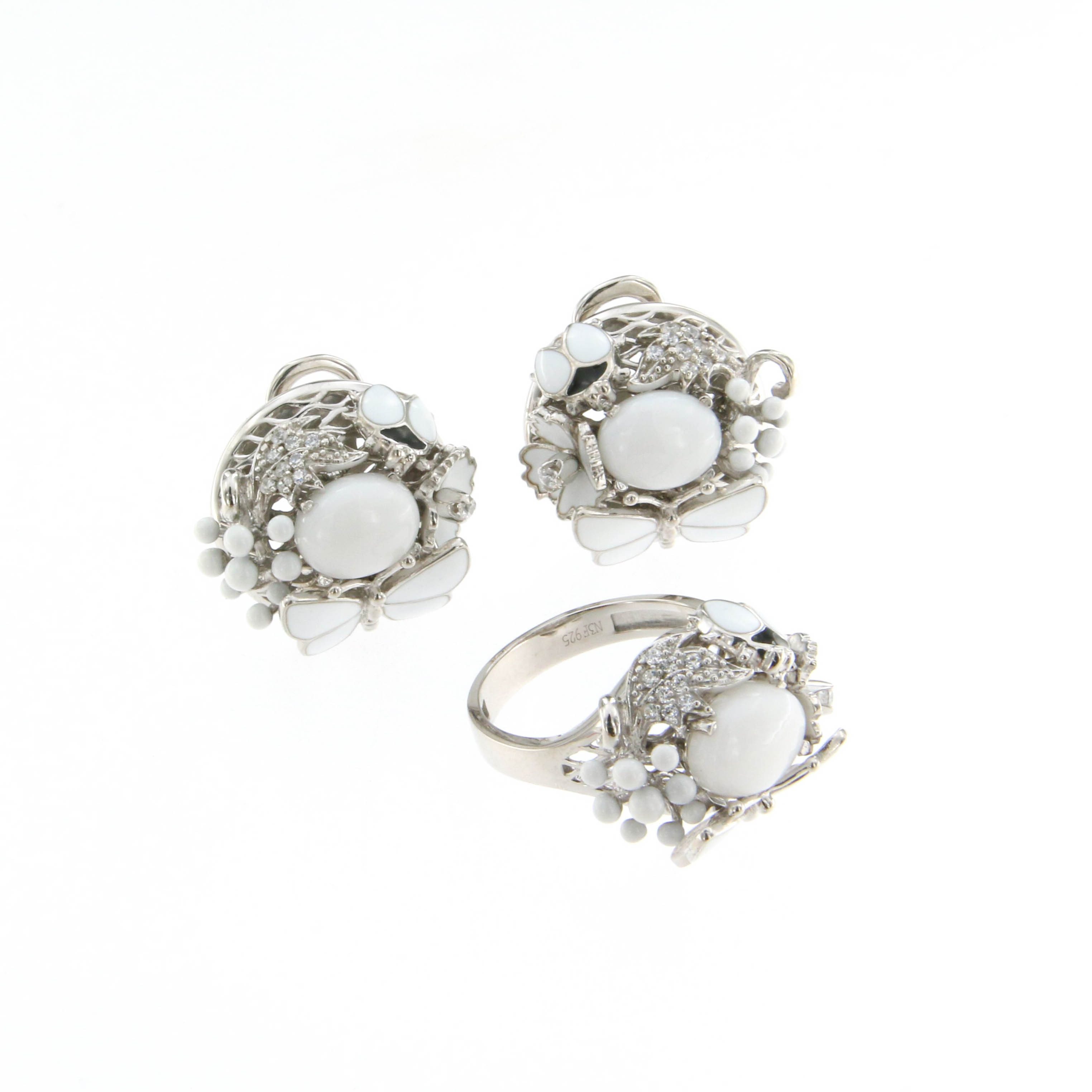 Комплект пръстен и обеци от "Jacklin " в сребро с бял ахат, цветен емайл и циркони