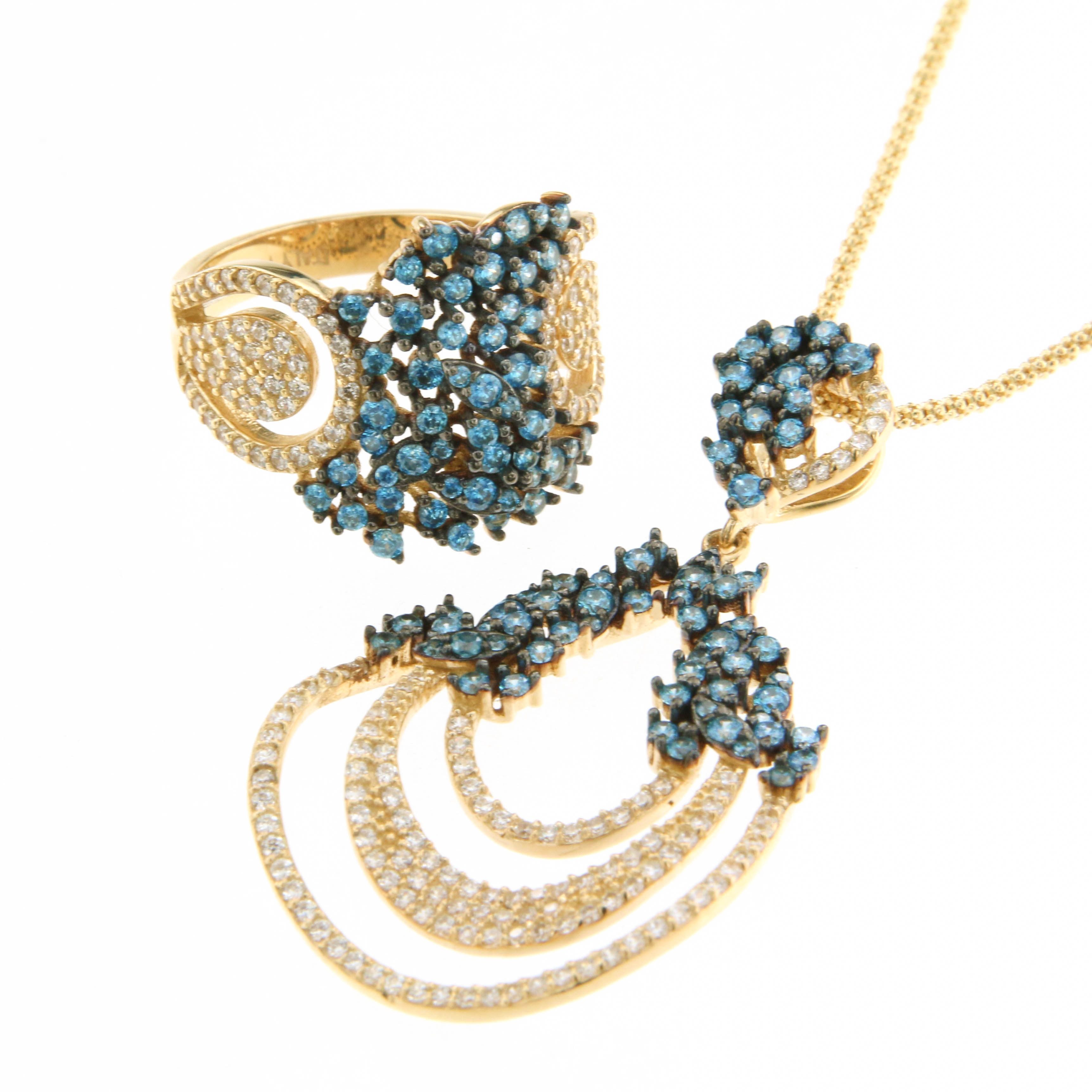 Комплект пръстен и висулка от “Jacklin hugasian” в жълто злато със син топаз и цирконии.
