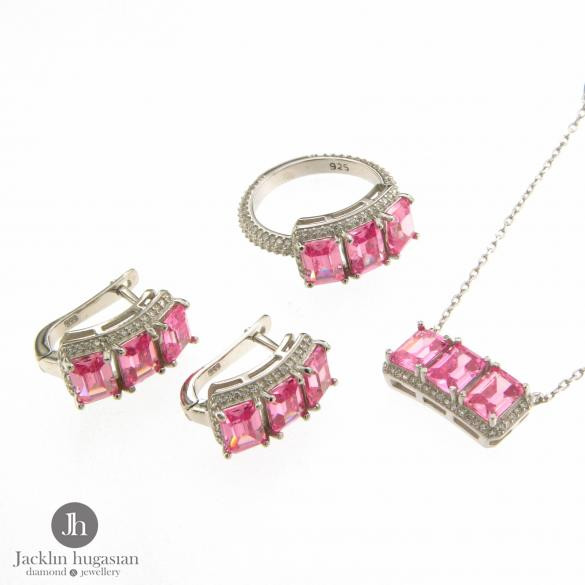 Комплект пръстен, колие и обеци от "Jacklin hugasian" в сребро с розов кварц и цирконии.