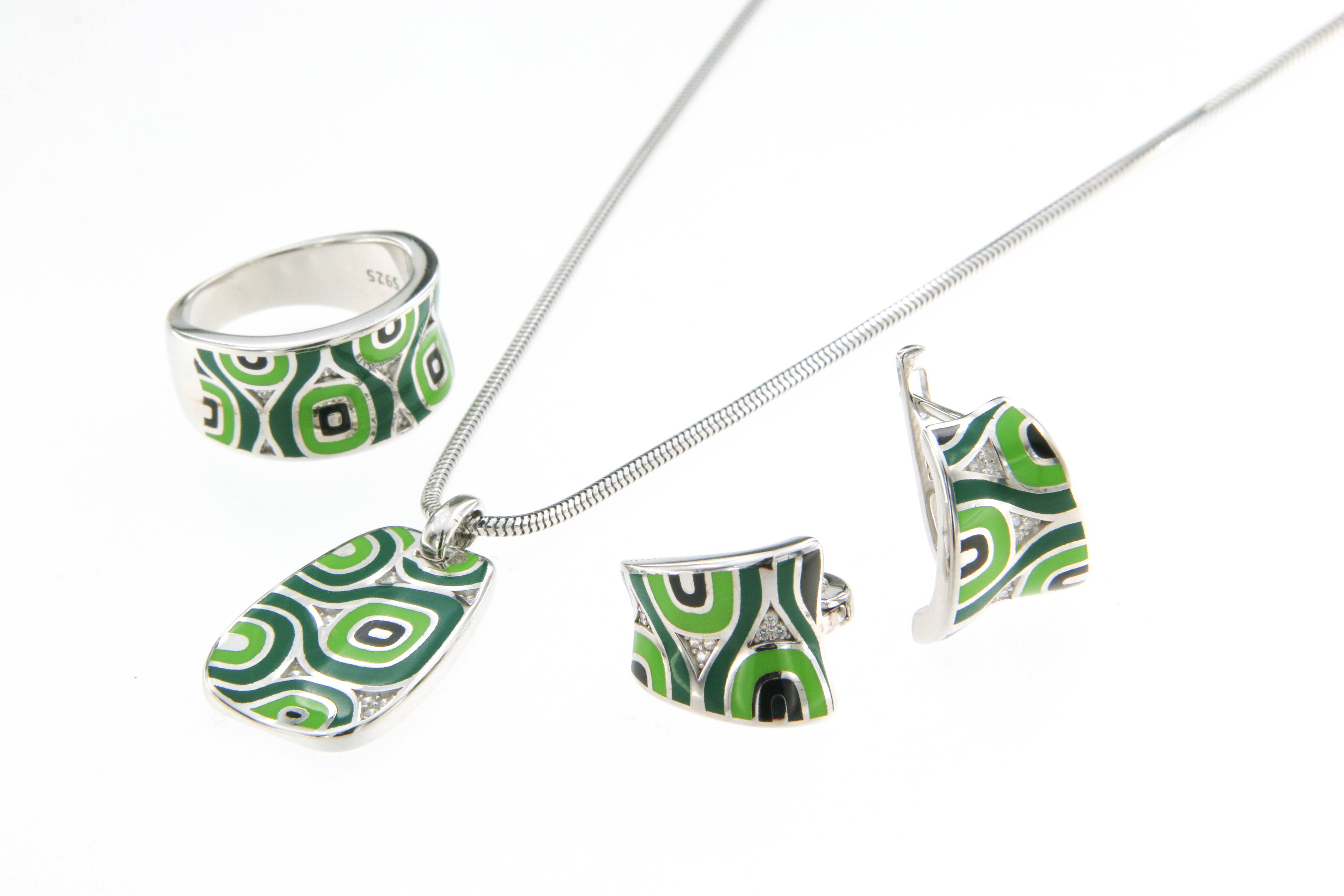 Комплект пръстен, колие и обеци от “Jacklin hugasian” в сребро с разноцветен емайл.