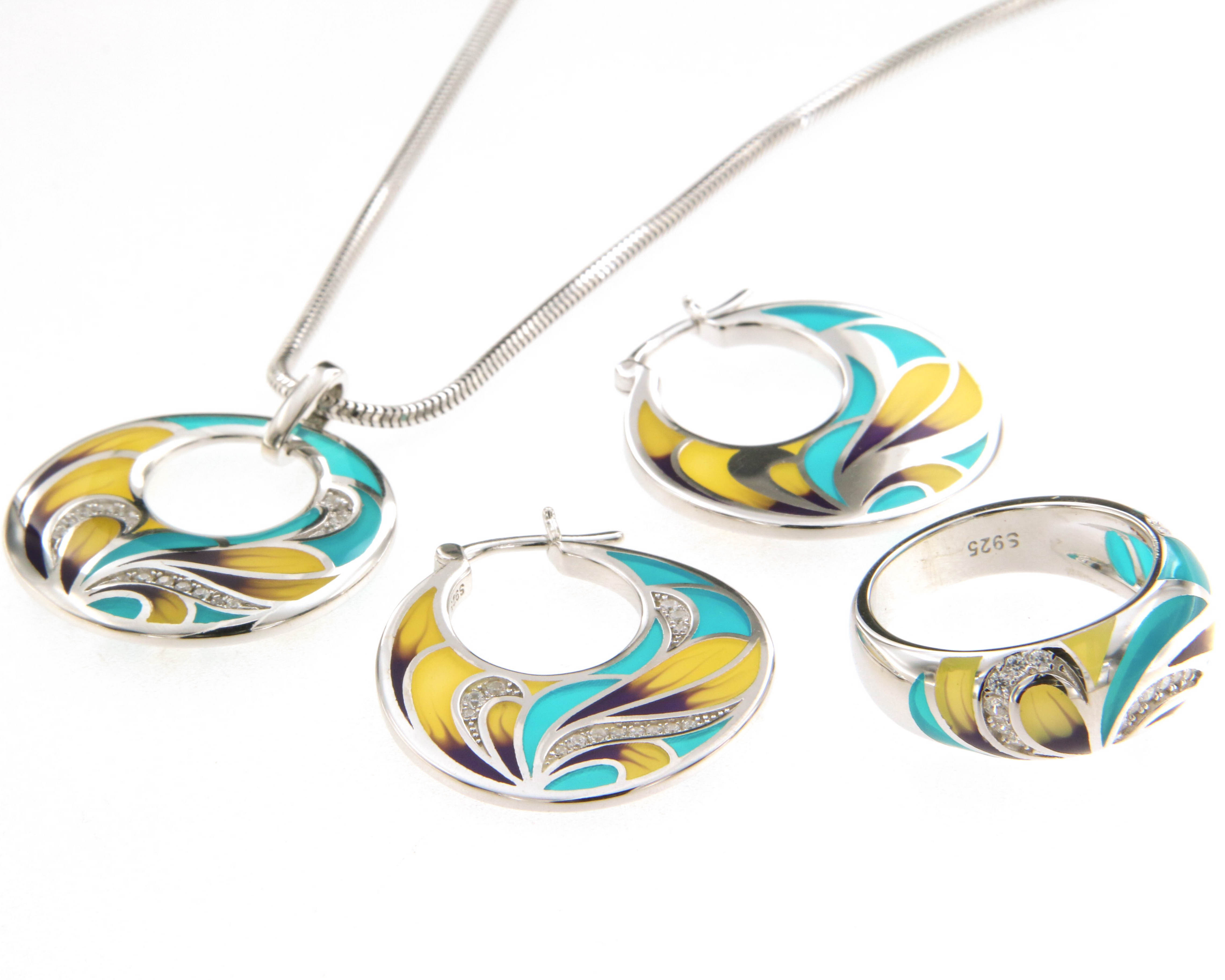 Комплект пръстен и колие от “Jacklin hugasian” в сребро с разноцветен емайл.