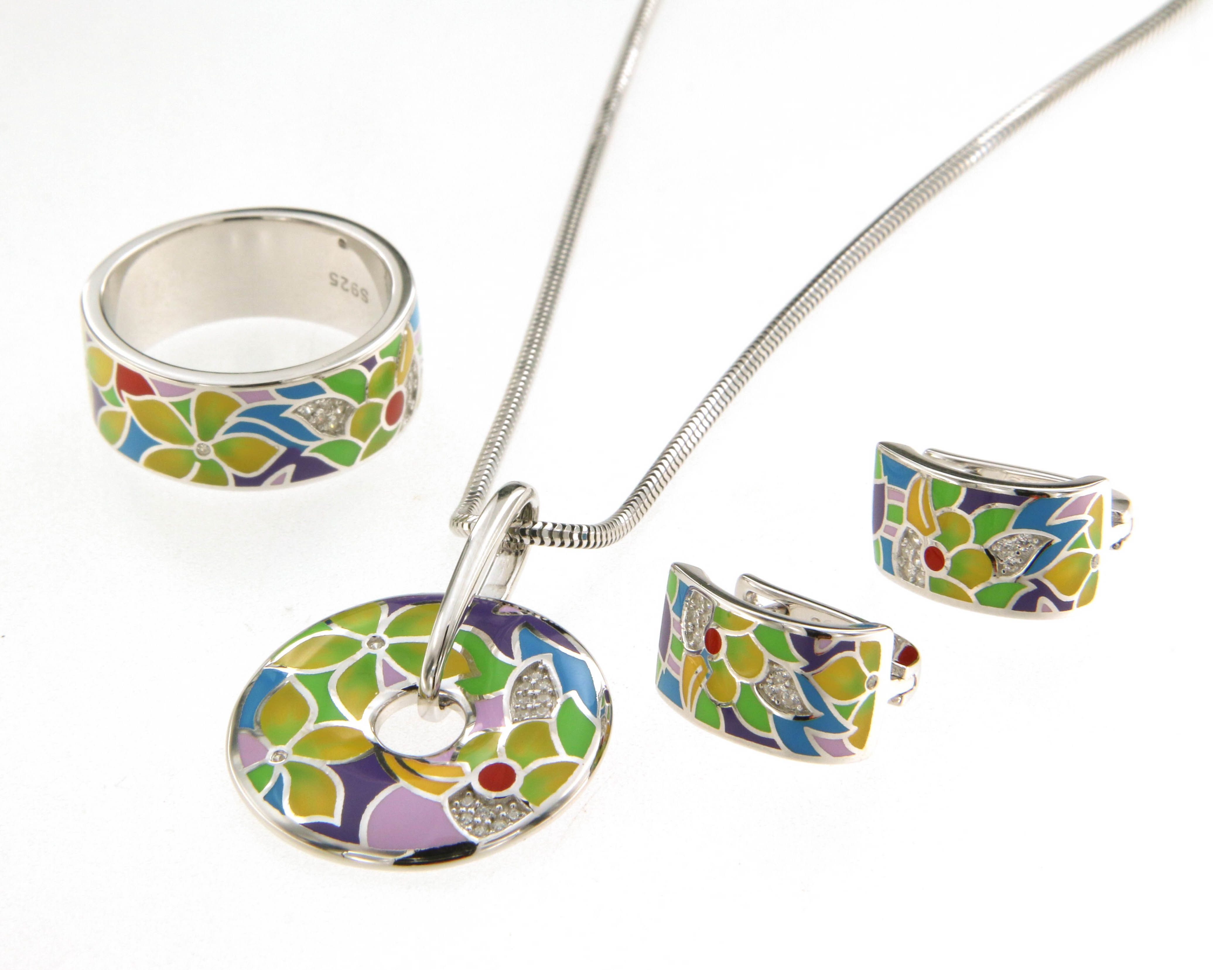 Комплект пръстен, колие и обеци от “Jacklin hugasian” в сребро с разноцветен емайл. Дължина колие 54 см. Дължина обеци 1,5 см., широчина обеци 1,0 см. Колекция “TITI”.