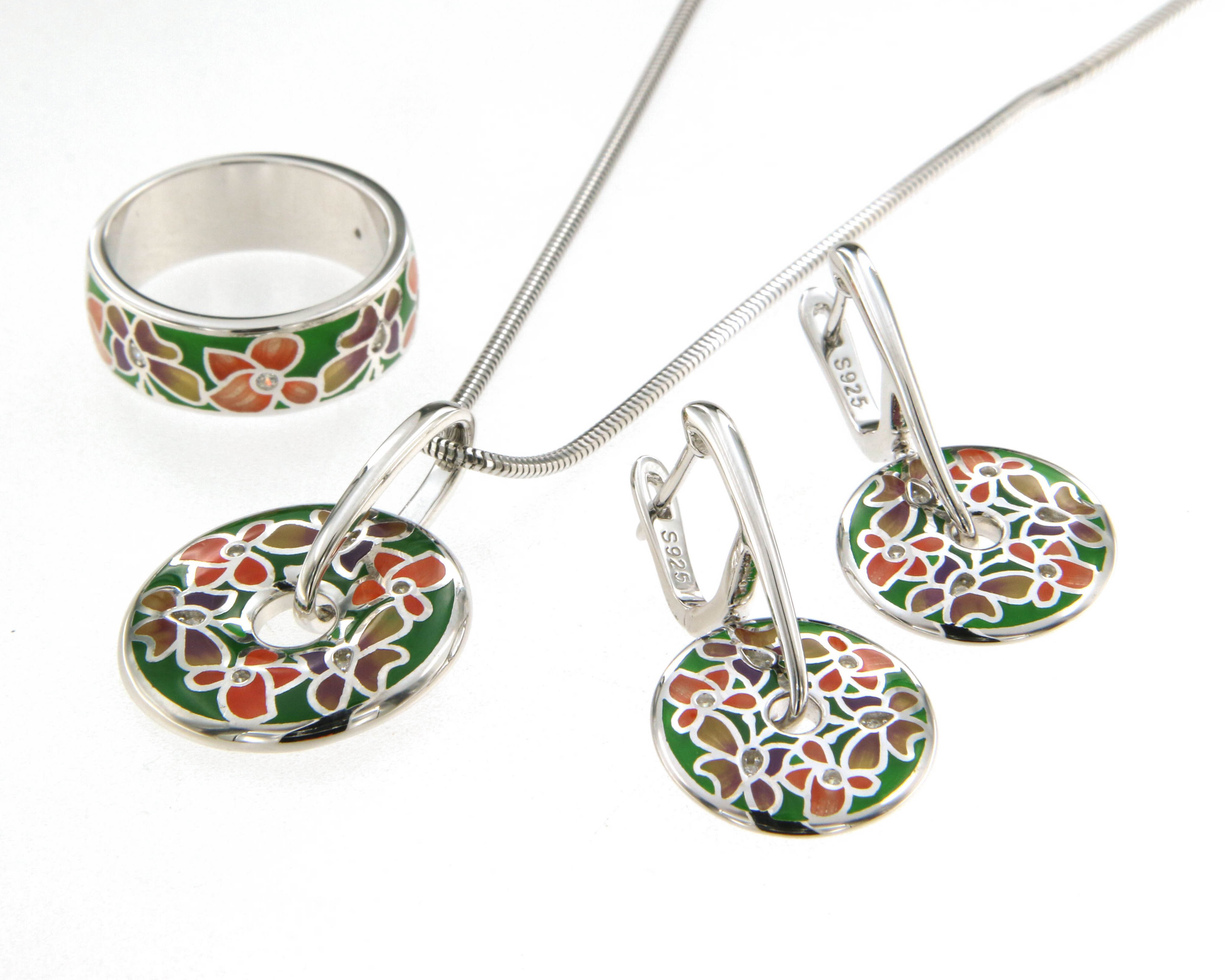 Комплект пръстен, колие и обеци от “Jacklin hugasian” в сребро с разноцветен емайл.