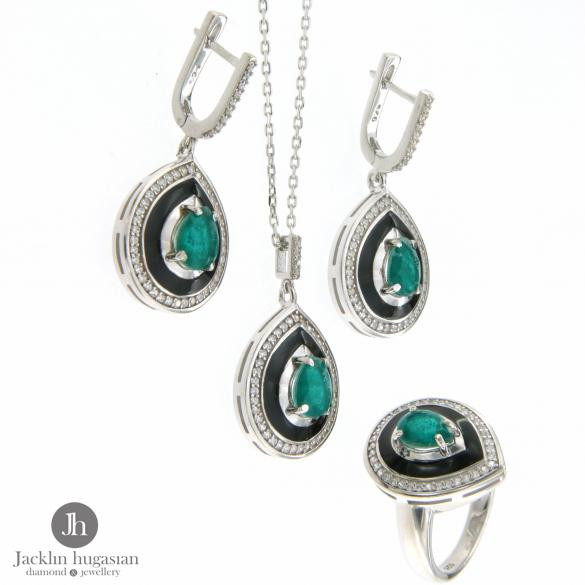 Пръстен от "Jacklin hugasian" в сребро с цирконии, зелен изумруд и черен емайл.