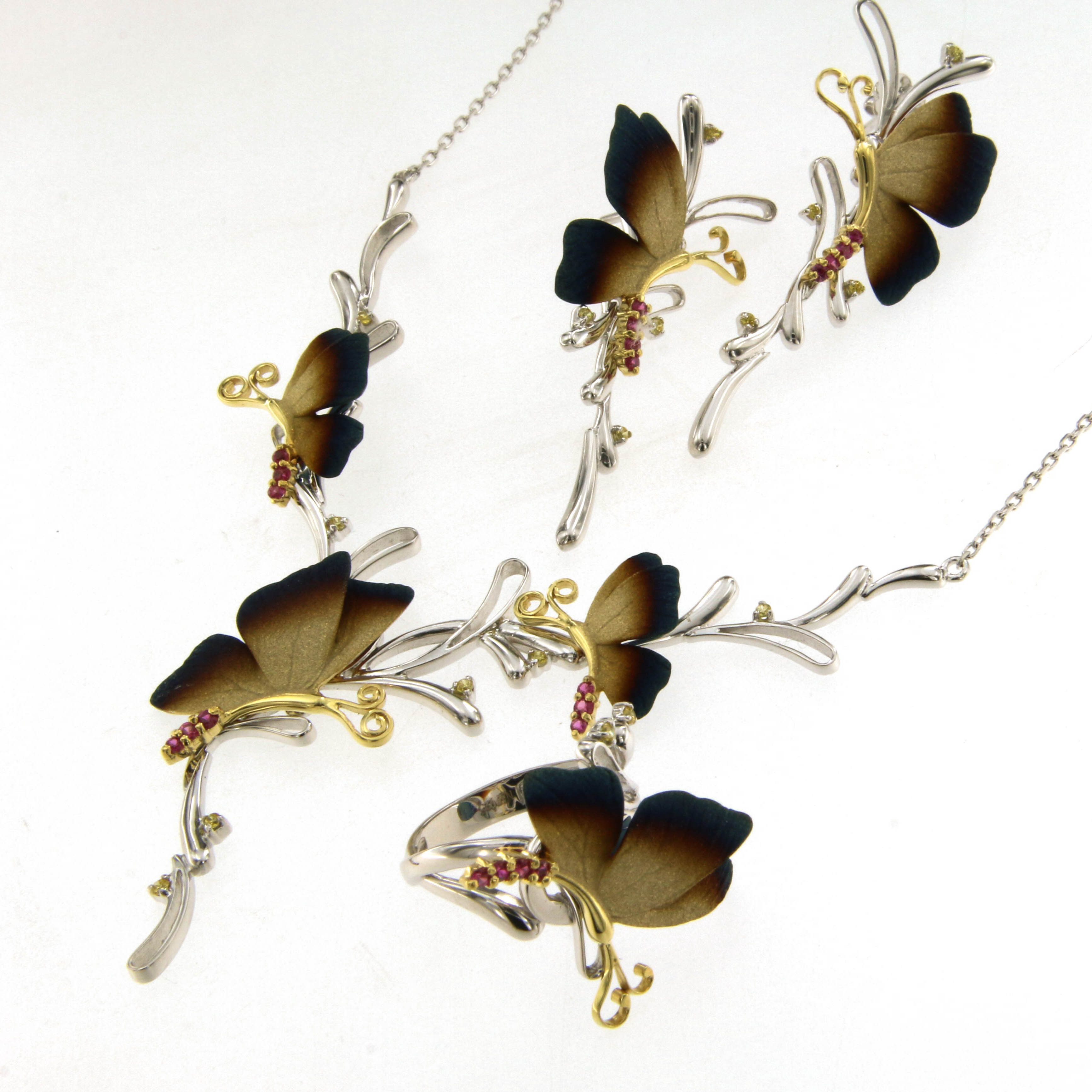 Комплект пръстен, обеци и колие от "Jacklin hugasian" в сребро с цветен емайл, цитрин, рубин и циркони. Колекция "Roberto Bravo"