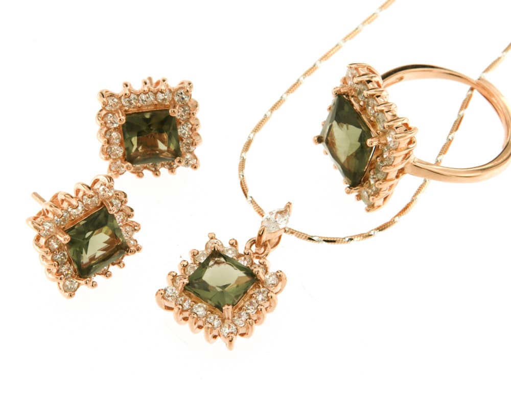 Обеци от " Jacklin hugasian " розово сребро с цирконии и перидот.
