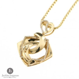 Комплект пръстен,обеци и висулка от " Jacklin hugasian " в жълто злато,гланц с цирконии.Дължина обеци 4.4 см.,широчина обеци 1.7 см.Дължина висулка 3.7 см.,широчина 2.7 см.