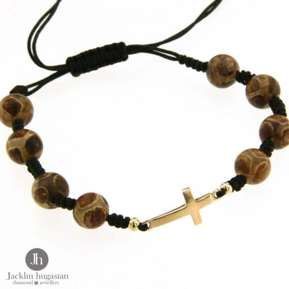 Мъжка гривна от "Jacklin hugasian" в жълто злато с кафяв ахат и текстилен конец.
