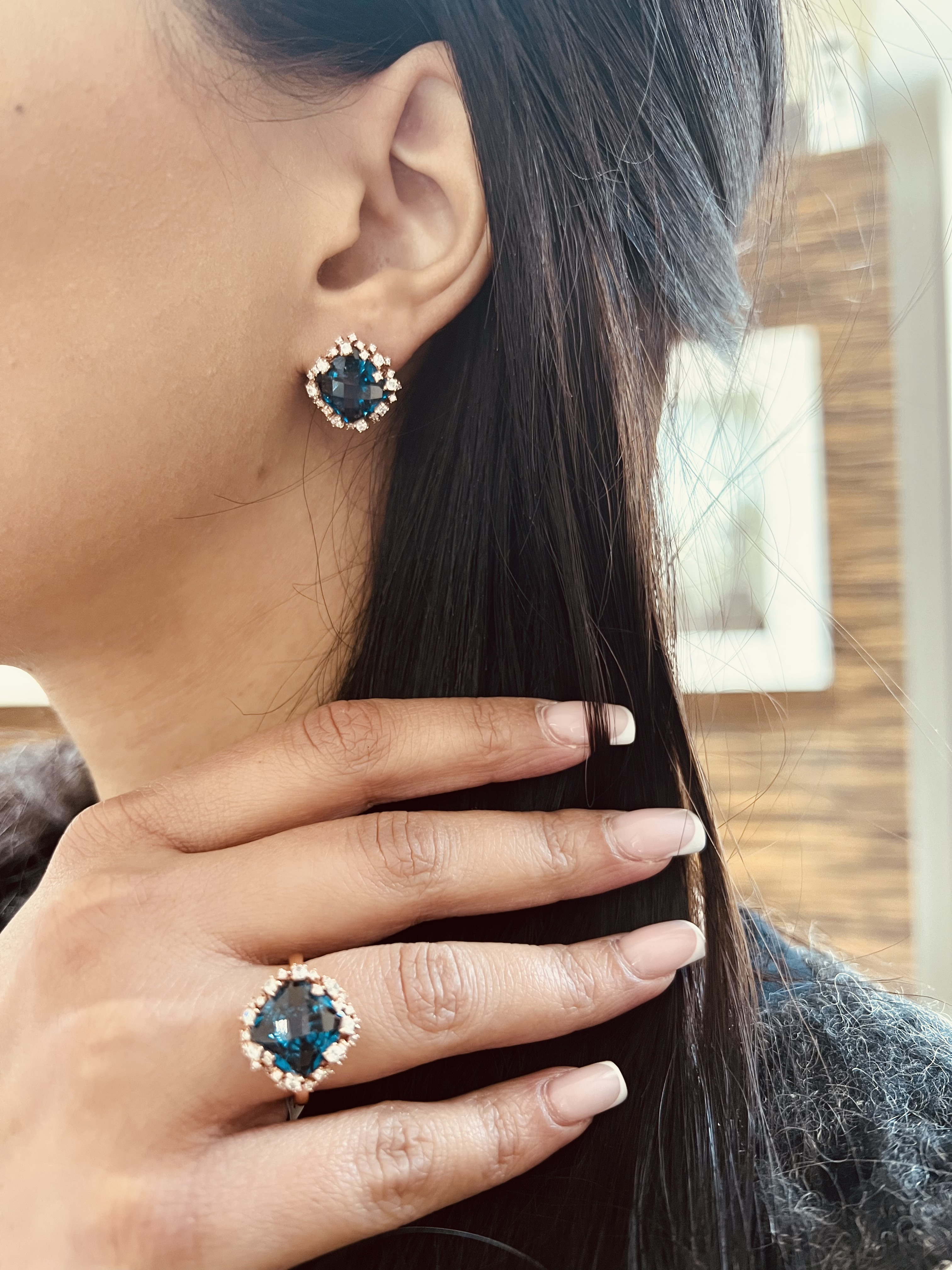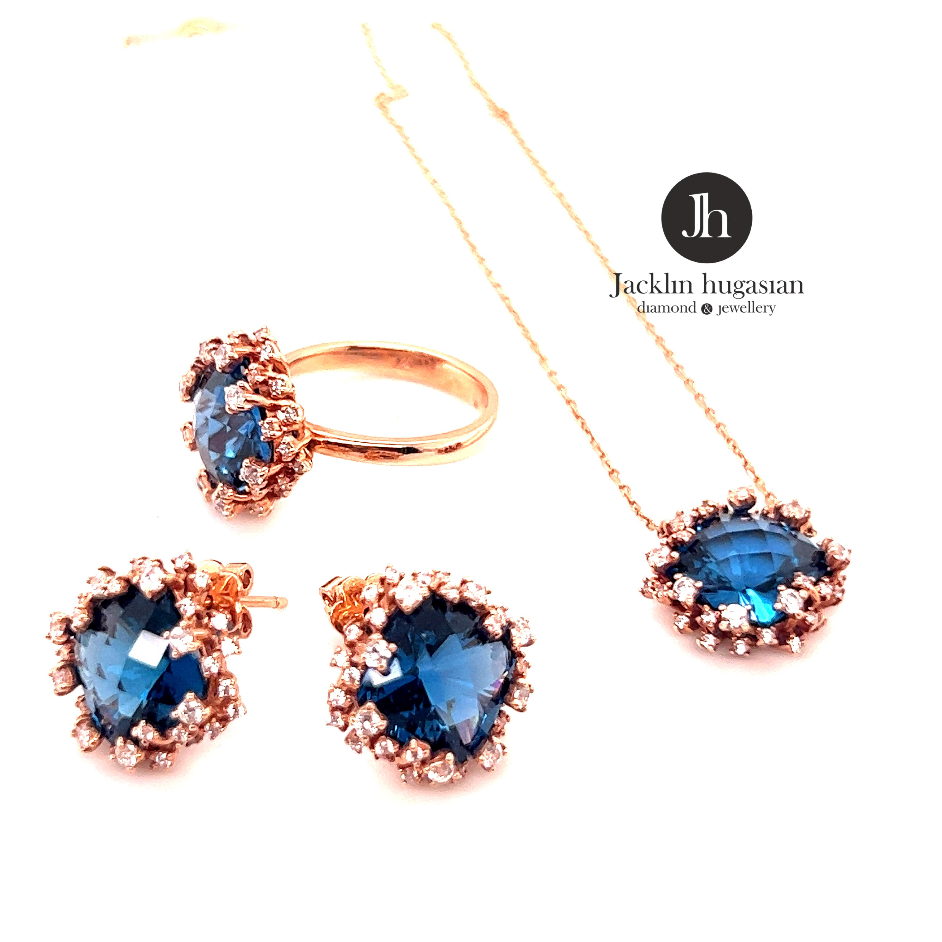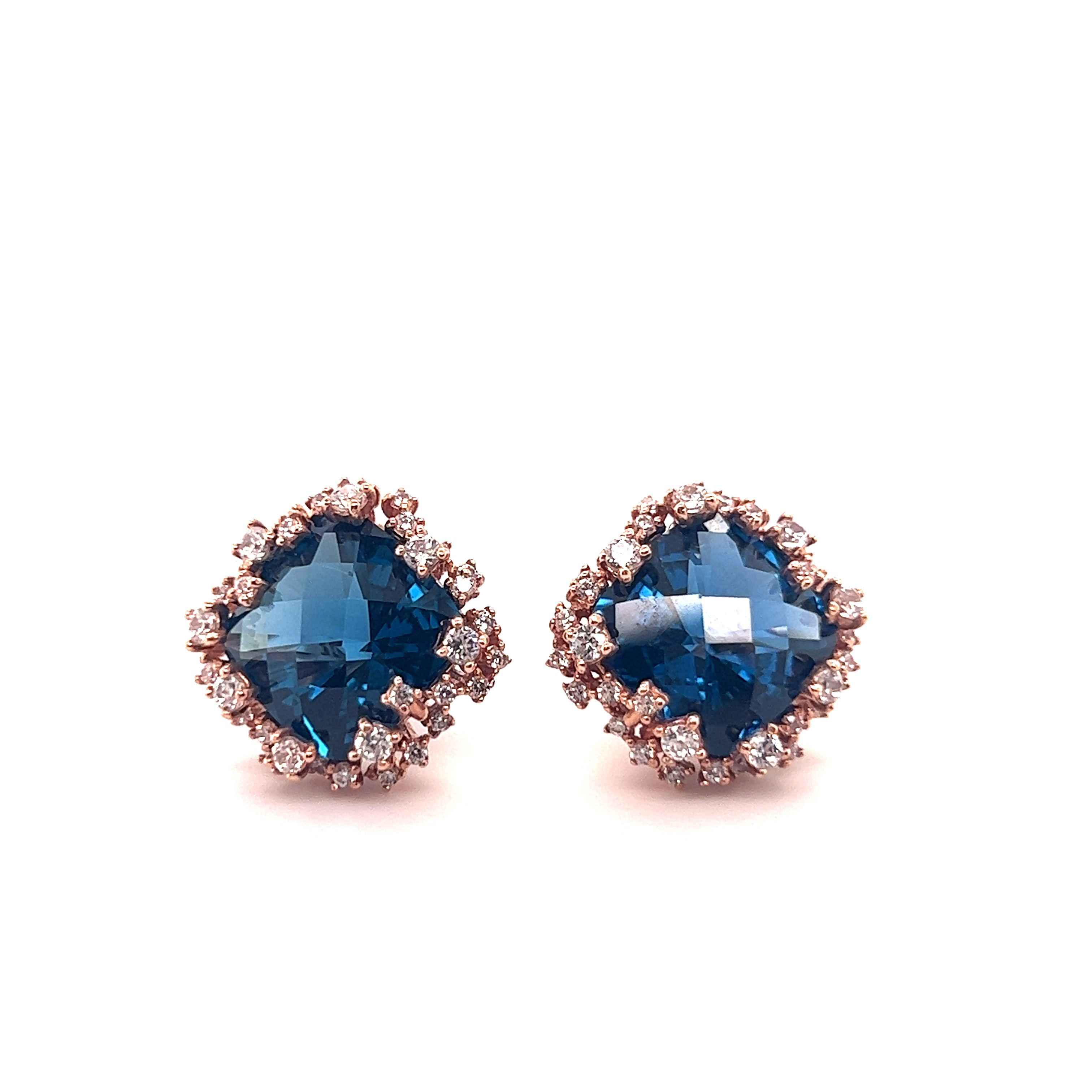 Обеци от “Jacklin hugasian” в розово злато с Лондон топаз и цирконии.