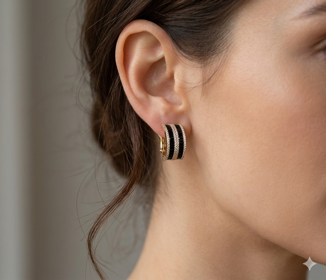 Обеци от "Jacklin hugasian" в сребро с позлата, с оникс и циркони.