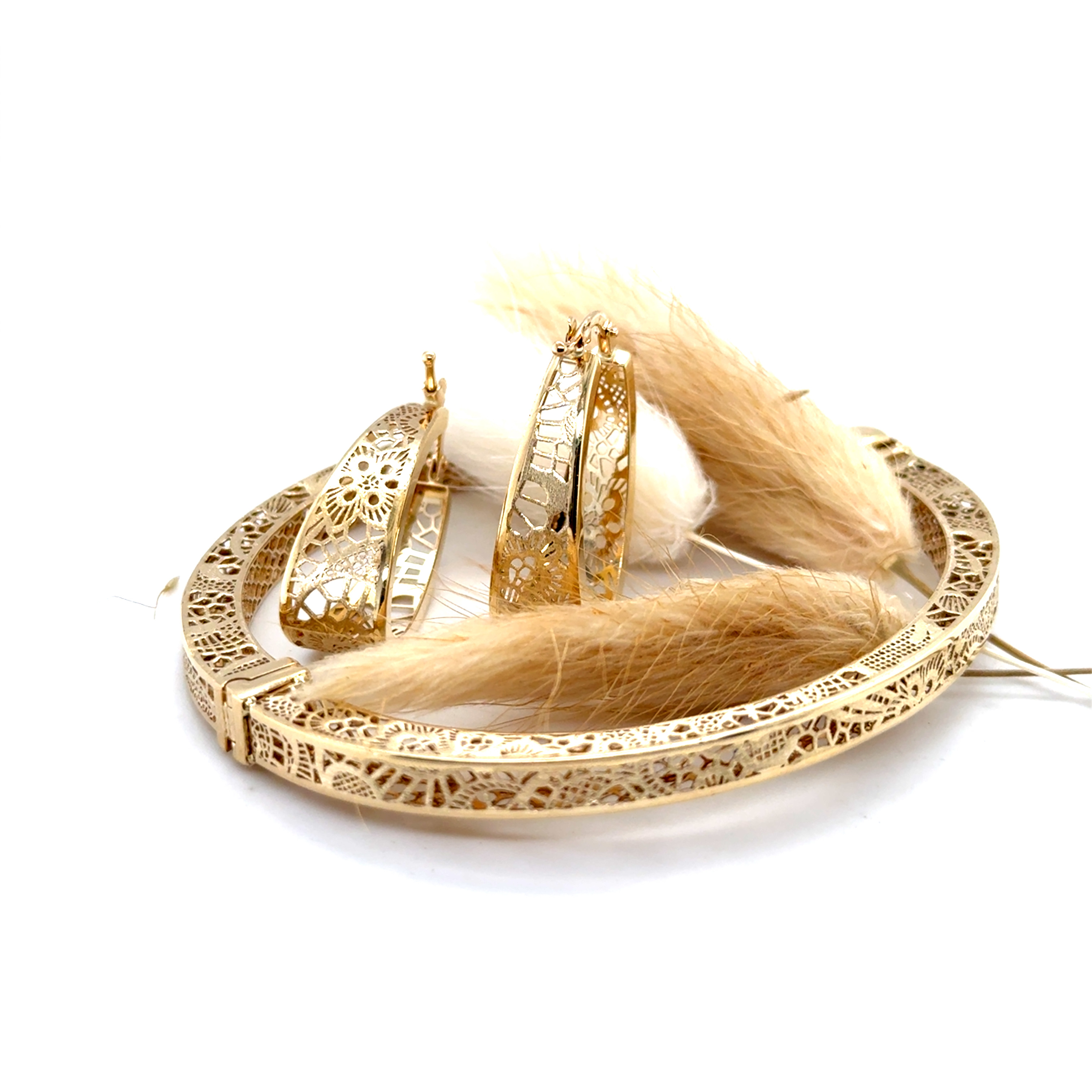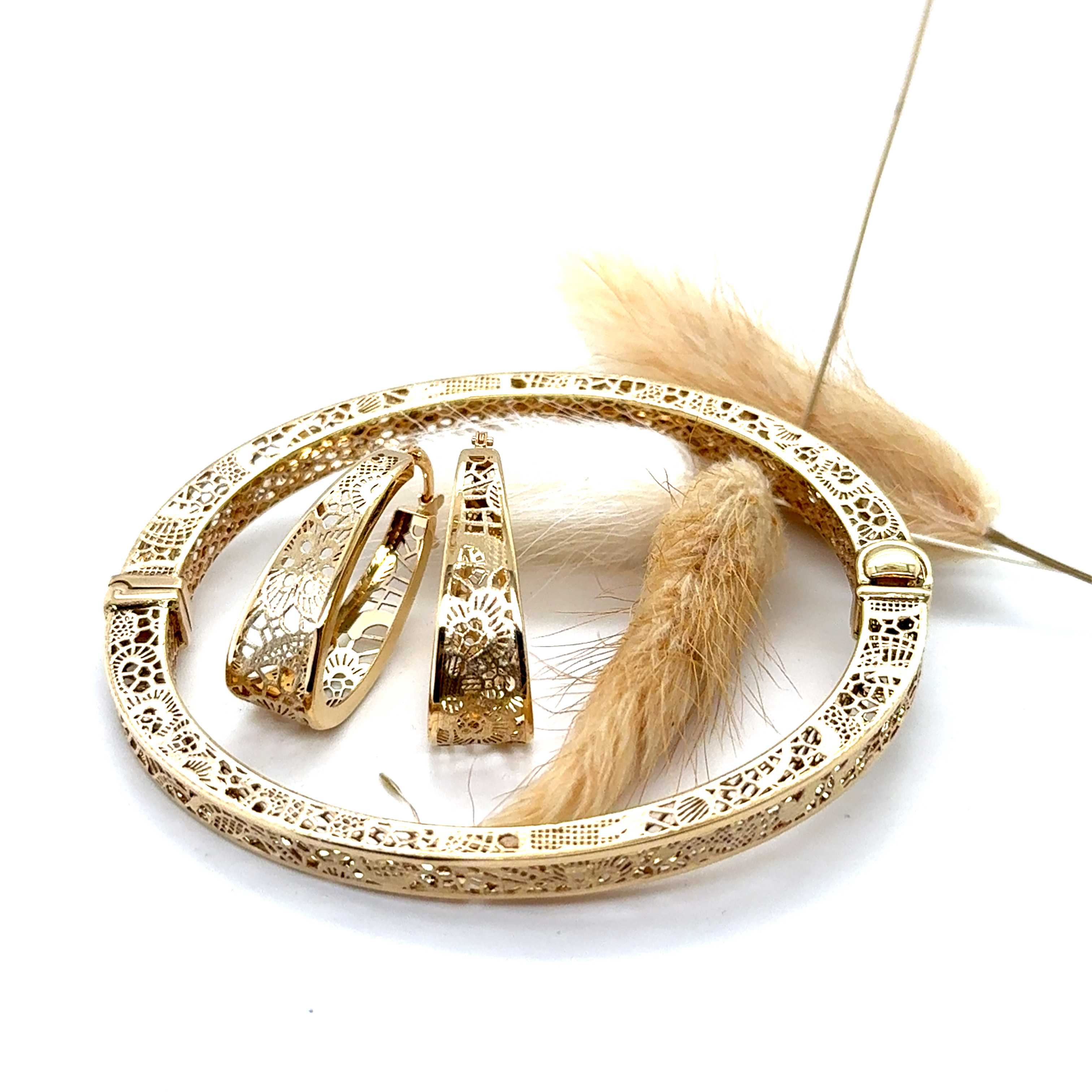 Обеци от “Jacklin hugasian” в жълто злато мат и гланц.Филигранна изработка.