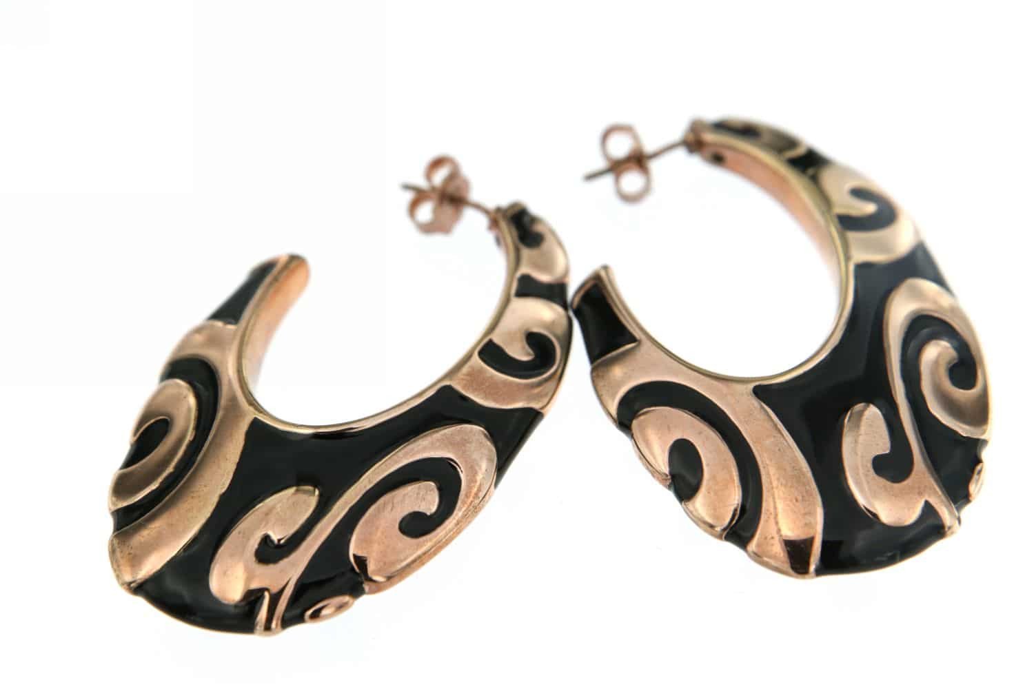 Обеци от "Jacklin hugasian " в розово сребро с черен емайл.